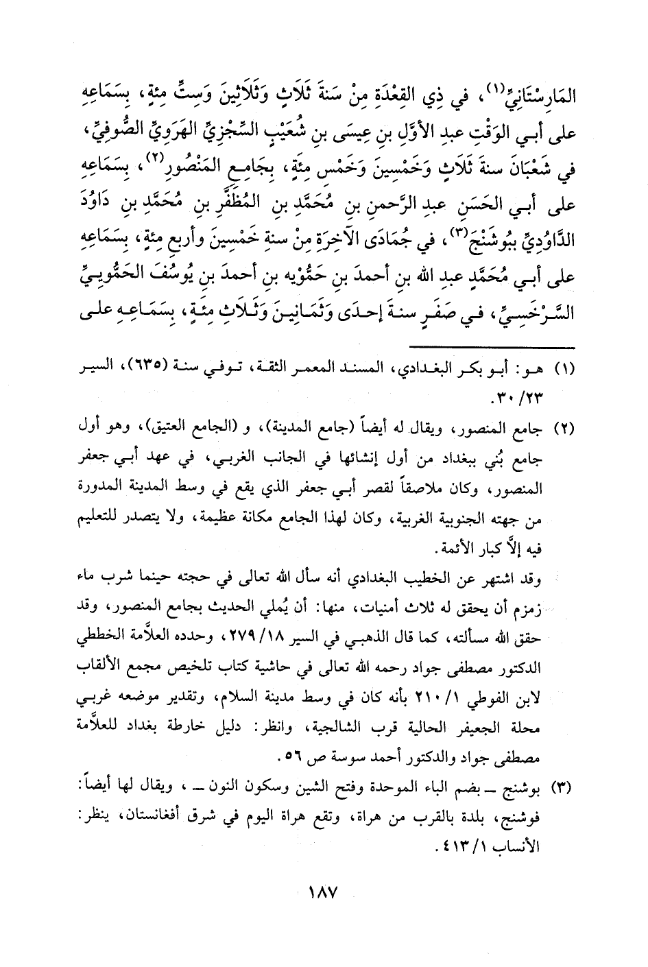 المارستاني في ذي القعدة من سنة ثلاثٍ وثلاثين وست مئةٍ، بسماعه على أبي الوقت عبد الأول بن عيسى بن شعيب السجزي الهروي الصوفي، في شبعان سنة ثلاثٍ وخمسين وخمس مئةٍ، بجامع المنصور بسماعه على أبي الحسن عبد الرحمن بن محمد بن المظفر بن محمد بن داود الدودي ببوشنج، في جمادى الآخرة من سنة خمسين وأربع مئةٍ، بسماعه على أبي محمدٍ عبد الله بن أحمد بن حمويه بن أحمد بن يوسف الحمويي السرخسي، في صفرٍ سنة إحدى وثمانين وثلاث مئةٍ، بسماعه على