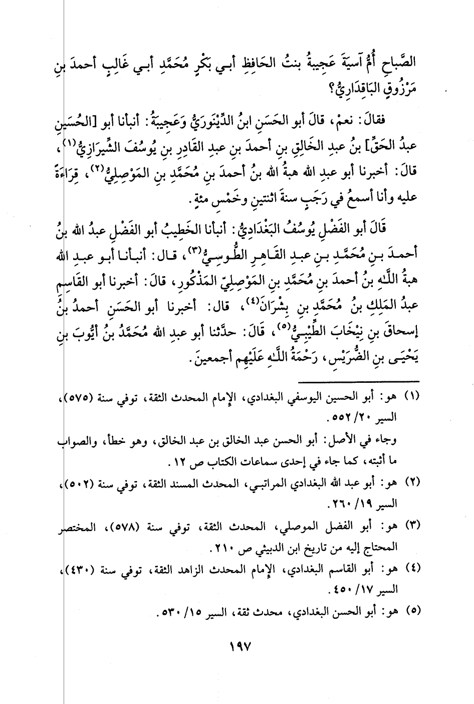 فقال: نعم، قال أبو الحسن ابن الدينوري وعجيبة: أنبأنا أبو [الحسين عبد الحق] بن عبد الخالق بن أحمد بن عبد القادر بن يوسف الشيرازي، قال: أخبرنا أبو عبد الله هبة الله بن أحمد بن محمد بن الموصلي، قراءةً عليه وأنا أسمع في رجبٍ سنة اثنتين وخمس مئةٍ.