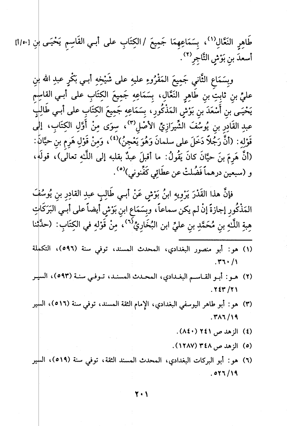 وبسماع الثاني جميع المقروء عليه على شيخه أبي بكر عبد الله بن علي بن ثابت بن طاهرٍ النعال، بسماعه جميع الكتاب على أبي القاسم يحيى بن أسعد بن بوش المذكور، بسماعه جميع الكتاب على أبي طالبٍ عبد القادر بن يوسف الشيرازي الأصل، سوى من أول الكتاب، إلى قوله: (أن رجلاً دخل على سلمان وهو يعجن) ، ومن قول هرم بن حيان: (أن هرم بن حيان كان يقول: ما أقبل عبدٌ بقلبه إلى الله تعالى) ، قوله، و (سبعين درهماً فضلت عن عطائي كفنوني) .