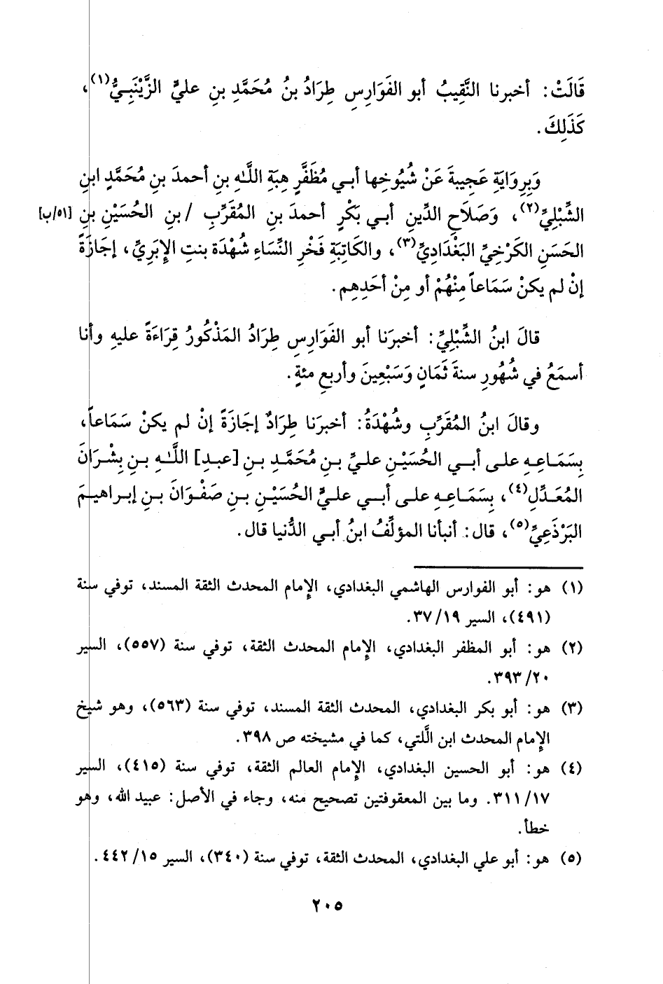 قال ابن الشبلي: أخبرنا أبو الفوارس طراد المذكور قراءةً عليه وأنا أسمع في شهور سنة ثمانٍ وسبعين وأربع مئةٍ.