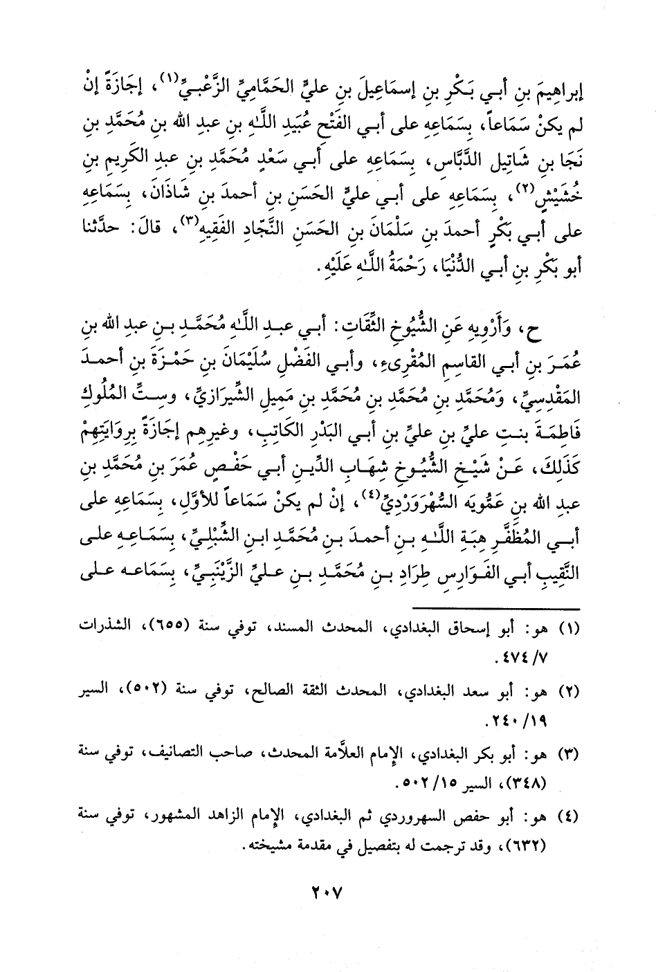 إبراهيم بن أبي بكر بن إسماعيل بن علي الحمامي الزعبي، إجازةً إن لم يكن سماعاً، بسماعه على أبي الفتح عبيد الله بن عبد الله بن محمد بن نجا بن شاتيل الدباس، بسماعه على أبي سعدٍ محمد بن عبد الكريم بن خشيش، بسماعه على أبي علي الحسن بن أحمد بن شاذان، بسماعه على أبي بكر أحمد بن سلمان بن الحسن النجاد الفقيه، قال: حدثنا أبو بكر بن أبي الدنيا، رحمة الله عليه.