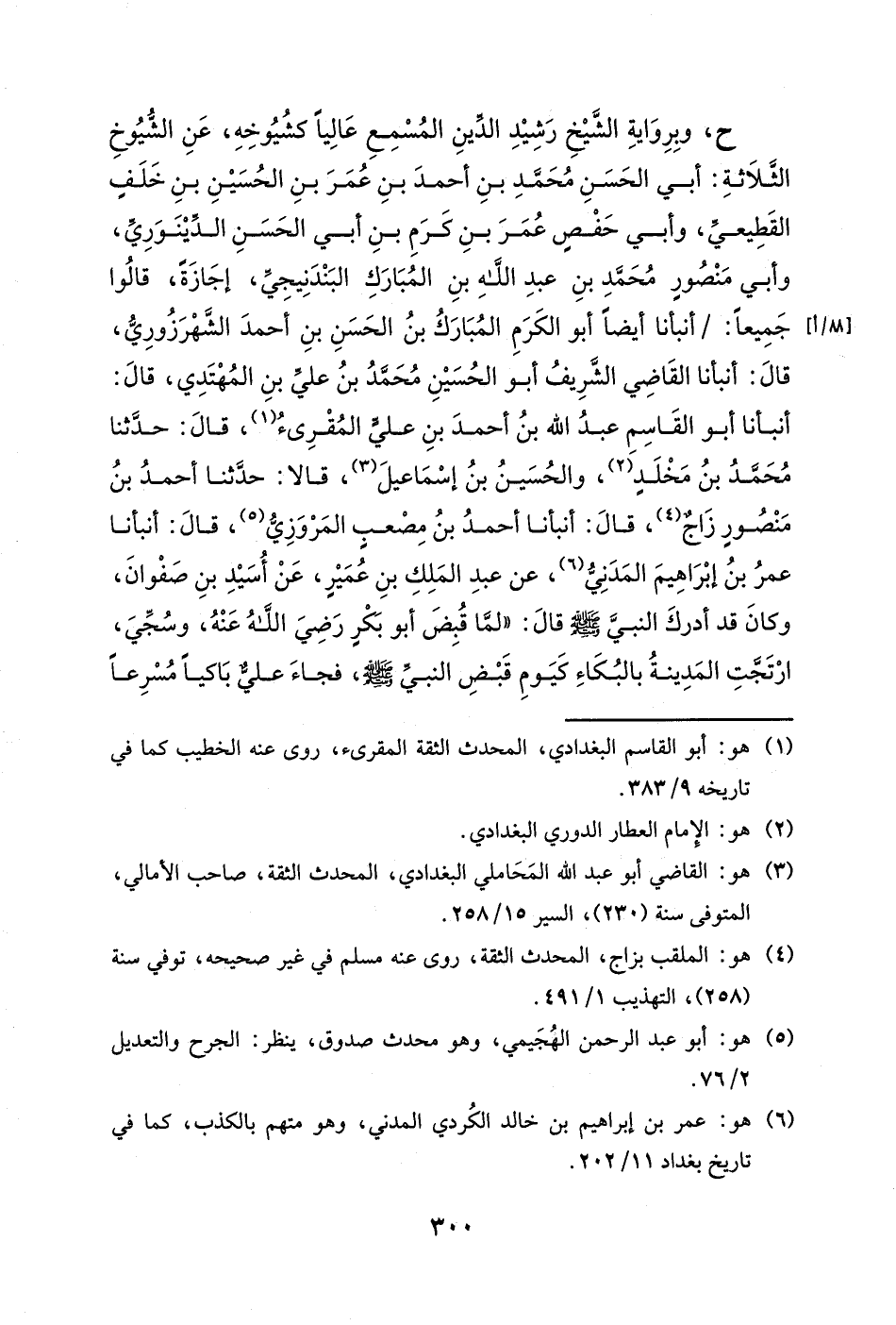 طراد بن محمد بن علي الزينبي، بسماعه على أبي الحسين علي بن محمد بن عبد الله بن بشران المعدل، بسماعه على أبي علي الحسين بن صفوان بن إبراهيم البرذعي، في جمادى الآخرة من سنة أربعين وثلاث مئةٍ، قال: حدثنا الإمام أبو بكر بن أبي الدنيا.