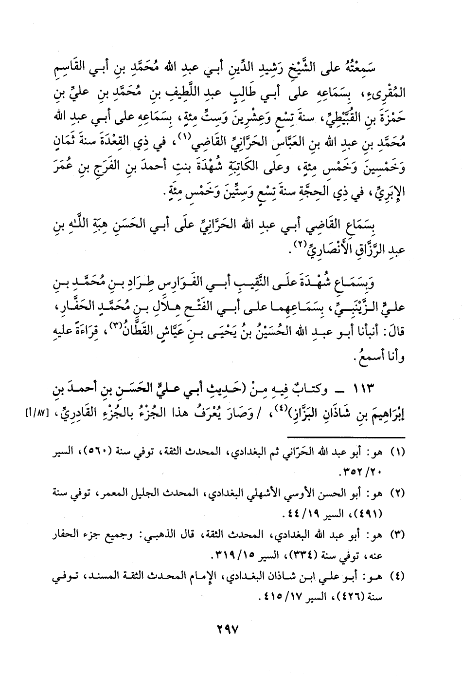 ح، وأرويه عن خلقٍ كثيرٍ، منهم: محمدٌ وعلي ابنا عبد الله بن عمر بن أبي القاسم، وعبيد الله بن مكي ابن أبي العز بن حمدون، وعبد الرحمن بن عبد الله بن علي بن الحسين البغدادي، ومحمد بن علي البالسي، إجازةً، عن أبي محمدٍ إبراهيم بن أبي الثناء محمود بن سالم بن مهدي المقرئ، وغيرهم ممن لا أحصيهم الآن كذلك، عن أبي الفتح محمد بن عبد الباقي بن أحمد بن سلمان عرف بابن البطي بسنده.