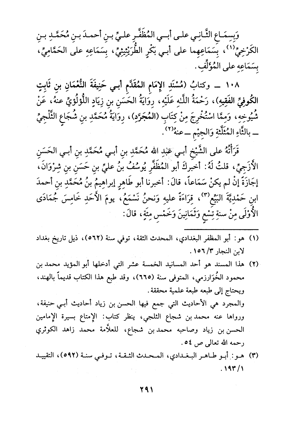 قرأته على الشيخ أبي الفضل داود بن أبي نصرٍ منصور بن أبي الحسن المبارك الأزجي العدل، رحمة الله تعالى، بروايته عن شيوخه الثلاثة: عبد اللطيف بن أبي محمدٍ عبد المنعم بن علي بن نصر بن الصيقل الحراني، وأبي سعدٍ الحسن بن محمد بن علي بن بقا السباك سبط ابن الجوزي، وأبي الحسن علي بن شيروان، إجازةً إن لم يكن سماعاً له عليهم أو على أحدهم، بسماعهم على الشيخ أبي محمدٍ عبد الله بن عبد الرحمن بن أيوب الحربي، بسماعه على أبي العز أحمد بن عبيد الله بن كادش العكبري، بسماعه على أبي طالبٍ محمد بن علي بن