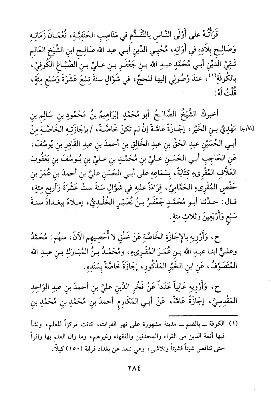 ح، وبرواية ابن طبرزد أيضاً، إجازةً إن لم يكن سماعاً من القاضي أبي بكر محمد بن عبد الباقي الأنصاري المارستاني البزاز، بسماعه على القاضي أبي يعلى.