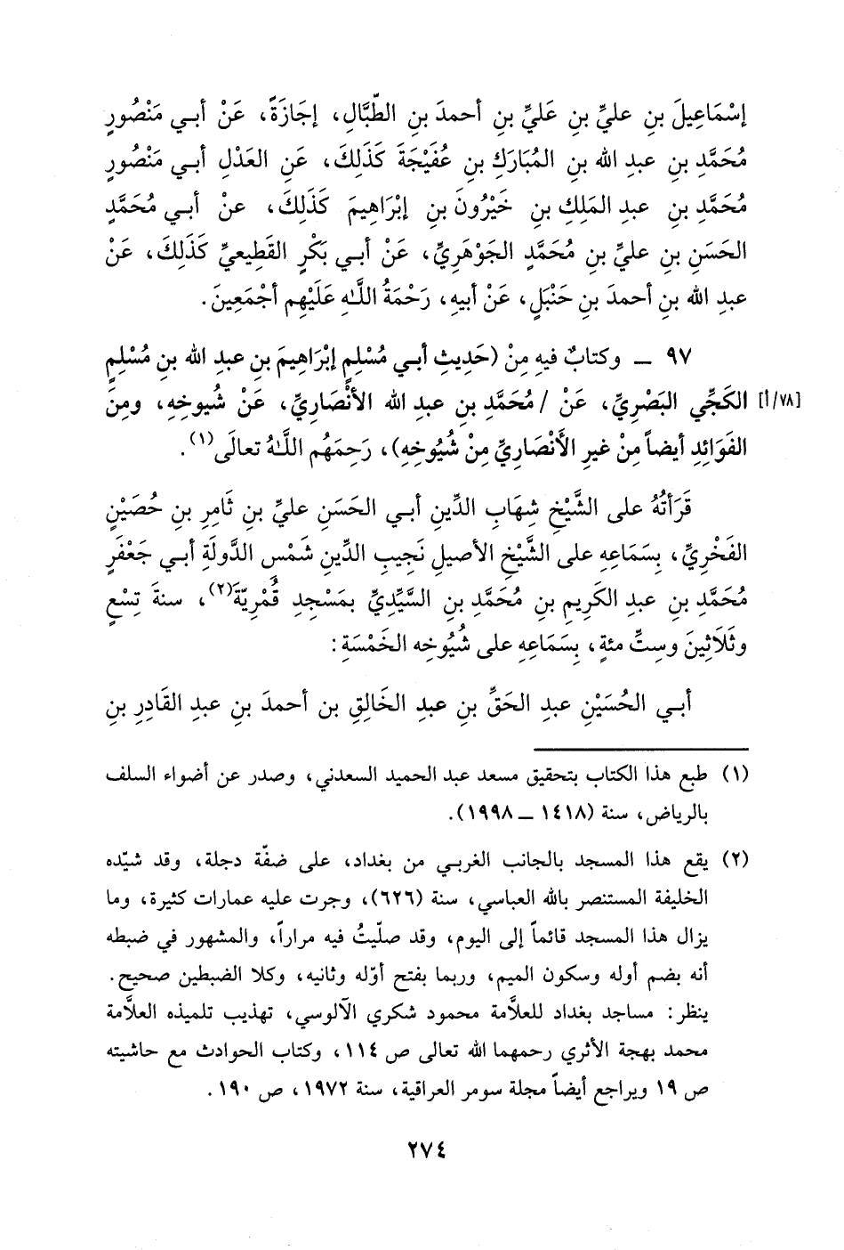 وبوقف خزانة ابن الشهرزوري الآن، بسماعه على أبي حفص عمر بن كرم بن أبي الحسن الدينوري، سنة تسع وعشرين وست مئةٍ، بقراءة الحافظ أبي منصور عبد الله بن محمد بن أبي الفضل ابن الوليد، في مجلسين آخرهما سابع جمادى الأولى، بسماعه على أبي الوقت عبد الأول بن عيسى بن شعيب السجزي الصوفي الهروي، بسماعه على أبي بكرٍ أحمد بن أبي نصرٍ الكوفاني، بسماعه على أبي محمدٍ الحسن بن محمد بن فوري الإستراباذي الجنوشاني، بسماعه على أبي نصرٍ السراج، رحمة الله عليهم أجمعين، سنة تسعٍ وعشرين وثلاث مئةٍ.