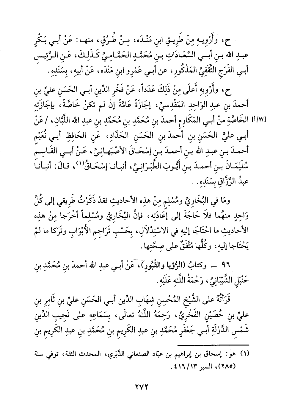 ح، وكذلك أروي تصانيف أبي عبد الرحمن السلمي إجازةً مع جميع مروياته بهذا الطريق العالي، عن شيوخي الأربعة، عن الشيخ شهاب الدين السهروردي، عن أبي الفتح محمد بن عبد الباقي بن أحمد بن سلمان، عرف بابن البطي إجازةً، عن أبي محمد رزق الله بن عبد الوهاب التميمي الإمام، عن أبي عبد الرحمن السلمي، بالإجازة المتصلة، ومن بعض مؤلفاته: