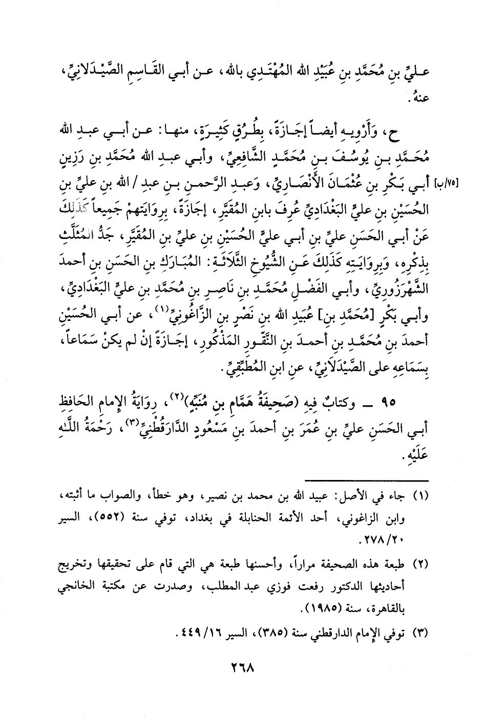 قرأته على أبي عبد الله محمد بن عبد المحسن بن أبي الحسن البغدادي، بروايته عن الشيخ أبي منصورٍ محمد بن علي بن عبد الصمد المقرئ الخياط، إجازةً إن لم تكن سماعاً، بسماعه على أبي الثناء محمود بن [أيتبا] بن عبد الله [الدمشقي] ، بسماعه على أبي القاسم صدقة بن محمد بن الحسين بن المحلبان، سبط [ابن] السياف، سنة ثمانٍ وأربعين وخمس مئةٍ، قال: أخبرنا أبو القاسم الفضل بن أبي حربٍ الجرجاني النيسابوري، قدم حاجاً، قال: أخبرنا أبو عبد الرحمن