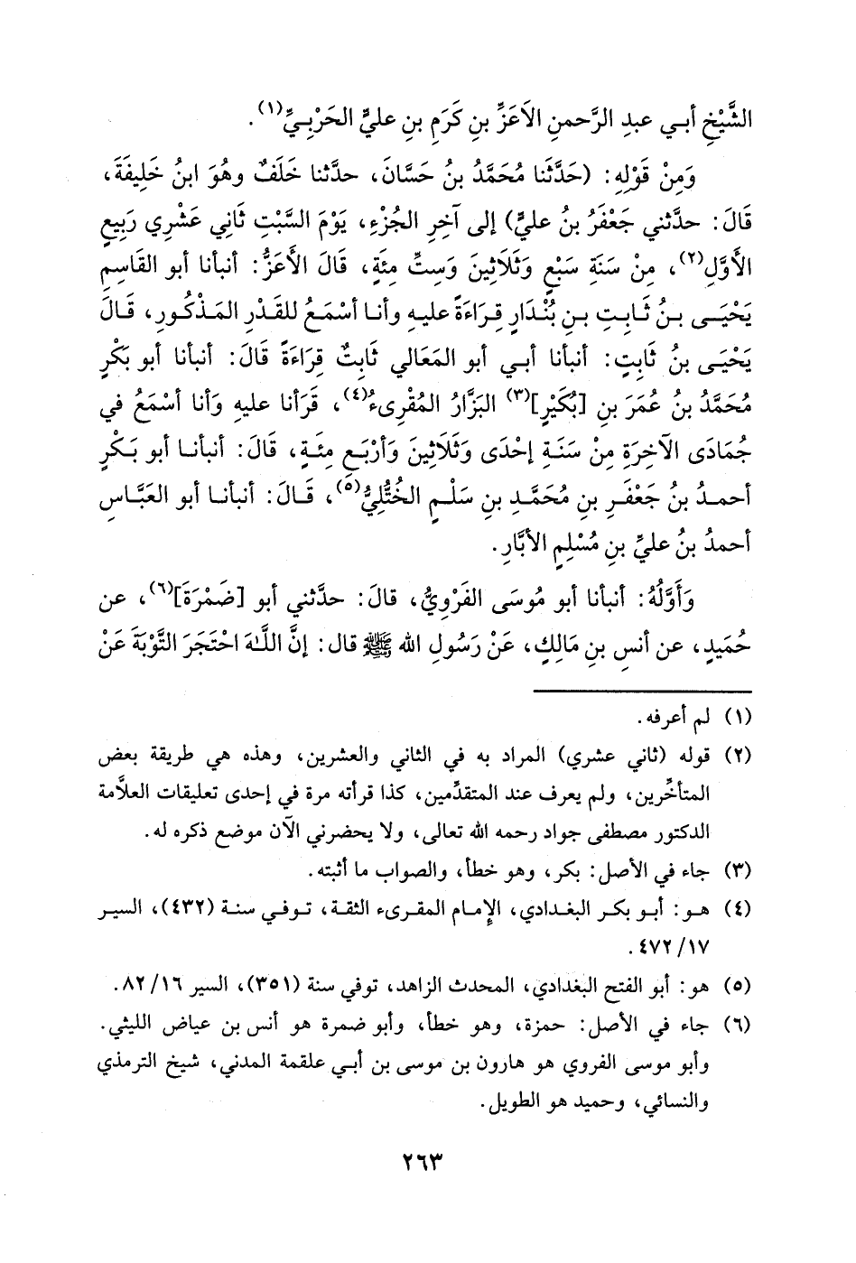 وقال أبو العباس العاقولي: أنبأنا أبو عبد الله محمد بن محمد بن أحمد المعروف بابن السلال، أنبأنا أبو الحسن جابر بن ياسين بن الحسن بن محمد بن أحمد بن محمويه الحنائي، قال: أنبأنا أبو طاهرٍ محمد بن عبد الرحمن بن العباس بن عبد الرحمن المخلص، بانتقاء ابن أبي الفوارس له.