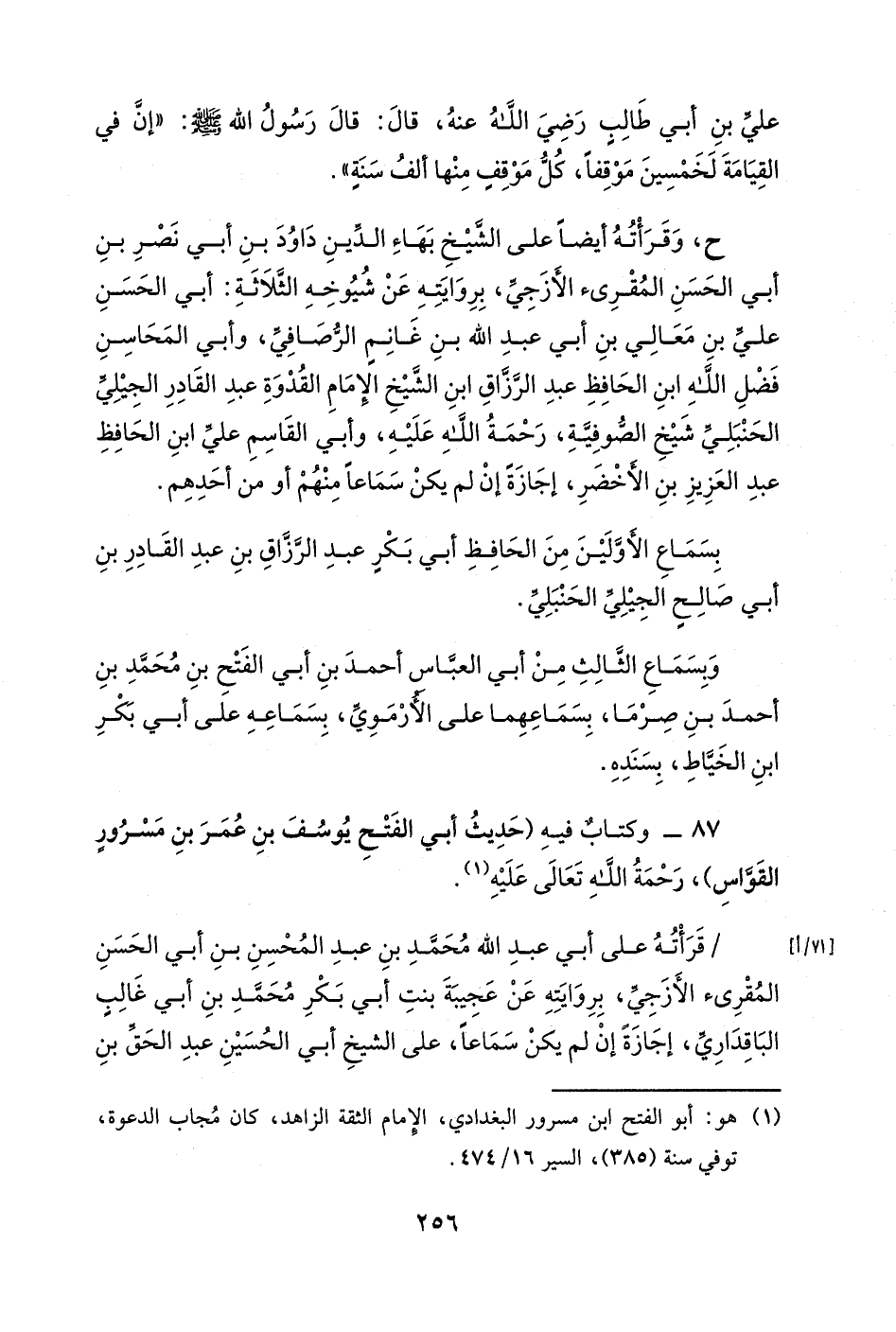 ح، برواية الشيخ رشيد الدين عالياً عن أبي حفص عمر بن كرم بن أبي الحسن الدينوري، والحافظ أبي الحسن محمد بن أحمد بن عمر بن خلفٍ القطيعي، وأبي منصور محمد بن عبد الله بن المبارك البندنيجي، والفتح بن عبد الله بن عبد السلام الكاتب، إجازةً إن لم يكن سماعاً على الأولين.