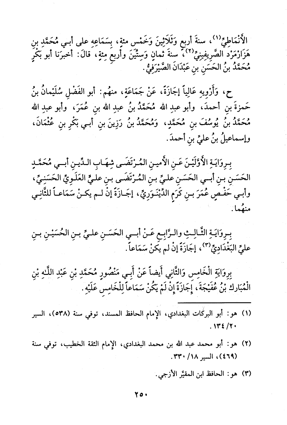 قرأته على الشيخ أبي عبد الله محمد بن عبد المحسن بن أبي الحسن المقرئ، بروايته عن شيخه أبي الحسن علي بن عبد اللطيف بن يحيى بن خطاب الدينوري الخيمي، وضوء الصباح أم آسية عجيبة بنت محمد بن أحمد الباقداري، إجازةً إن لم يكن سماعاً منهما أو من أحدهما، بروايتهما عن أبي الحسين عبد الحق بن عبد الخالق بن أحمد بن عبد القادر بن يوسف، بسماعه على الشيخ الإمام أبي نصرٍ عبد الرحمن بن أحمد بن سهلٍ السراج النيسابوري، قدم بغداد حاجاً، بسماعه على أبي عثمان سعيد بن