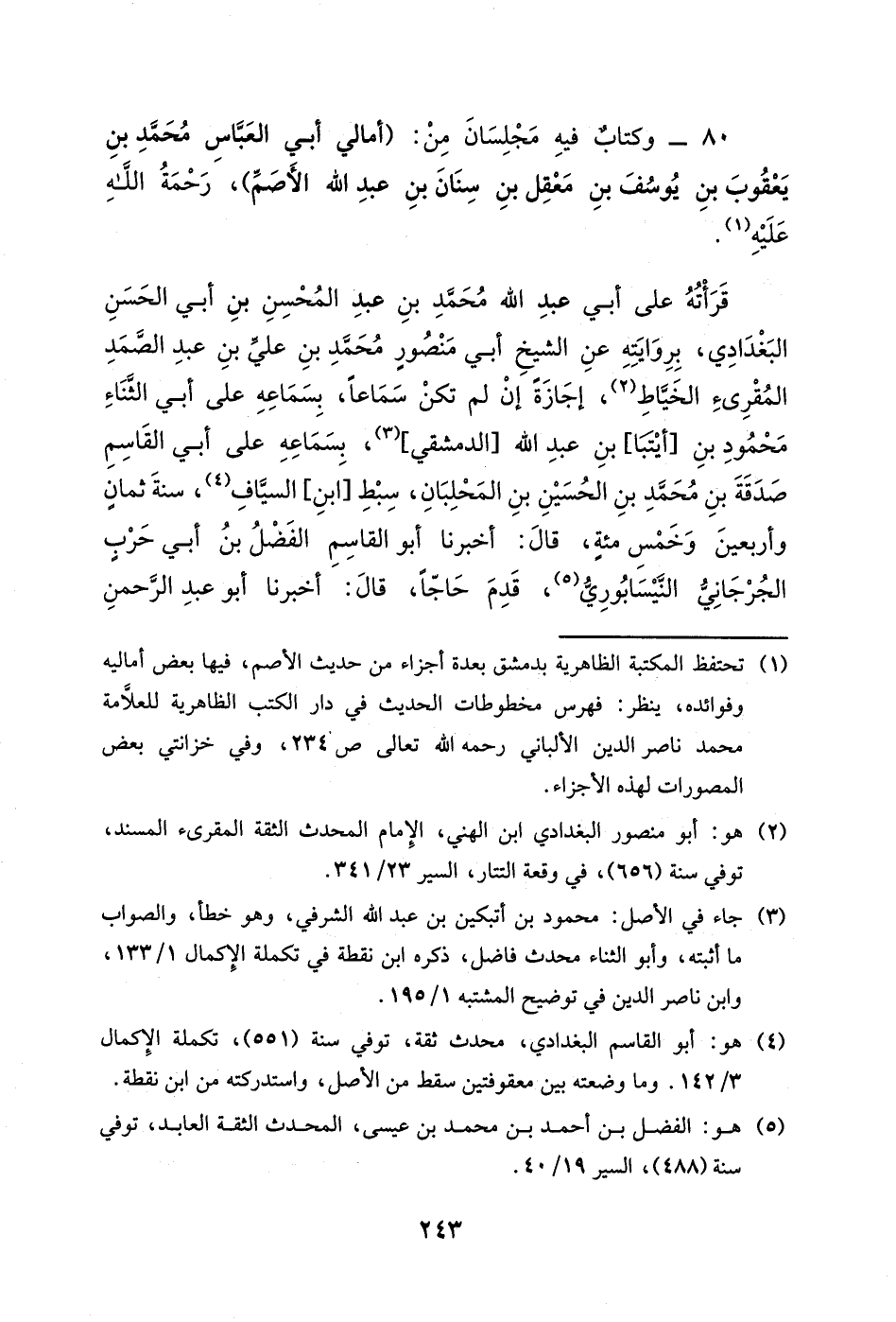 ح، وأرويه أيضاً إجازةً، بطرقٍ كثيرةٍ، منها: عن أبي عبد الله محمد بن يوسف بن محمد الشافعي، وأبي عبد الله محمد بن رزينٍ أبي بكر بن عثمان الأنصاري، وعبد الرحمن بن عبد الله بن علي بن الحسين بن علي البغدادي عرف بابن المقير، إجازةً، بروايتهم جميعاً كذلك عن أبي الحسن علي بن أبي علي الحسين بن علي بن المقير، جد المثلث بذكره، وبروايته كذلك عن الشيوخ الثلاثة: المبارك بن الحسن بن أحمد الشهرزوري، وأبي الفضل محمد بن ناصر بن محمد بن علي البغدادي، وأبي بكر [محمد بن] عبيد الله بن نصرٍ بن الزاغوني، عن أبي الحسين أحمد بن محمد بن أحمد بن النقور المذكور، إجازةً إن لم يكن سماعاً، بسماعه على الصيدلاني، عن ابن المطبقي.