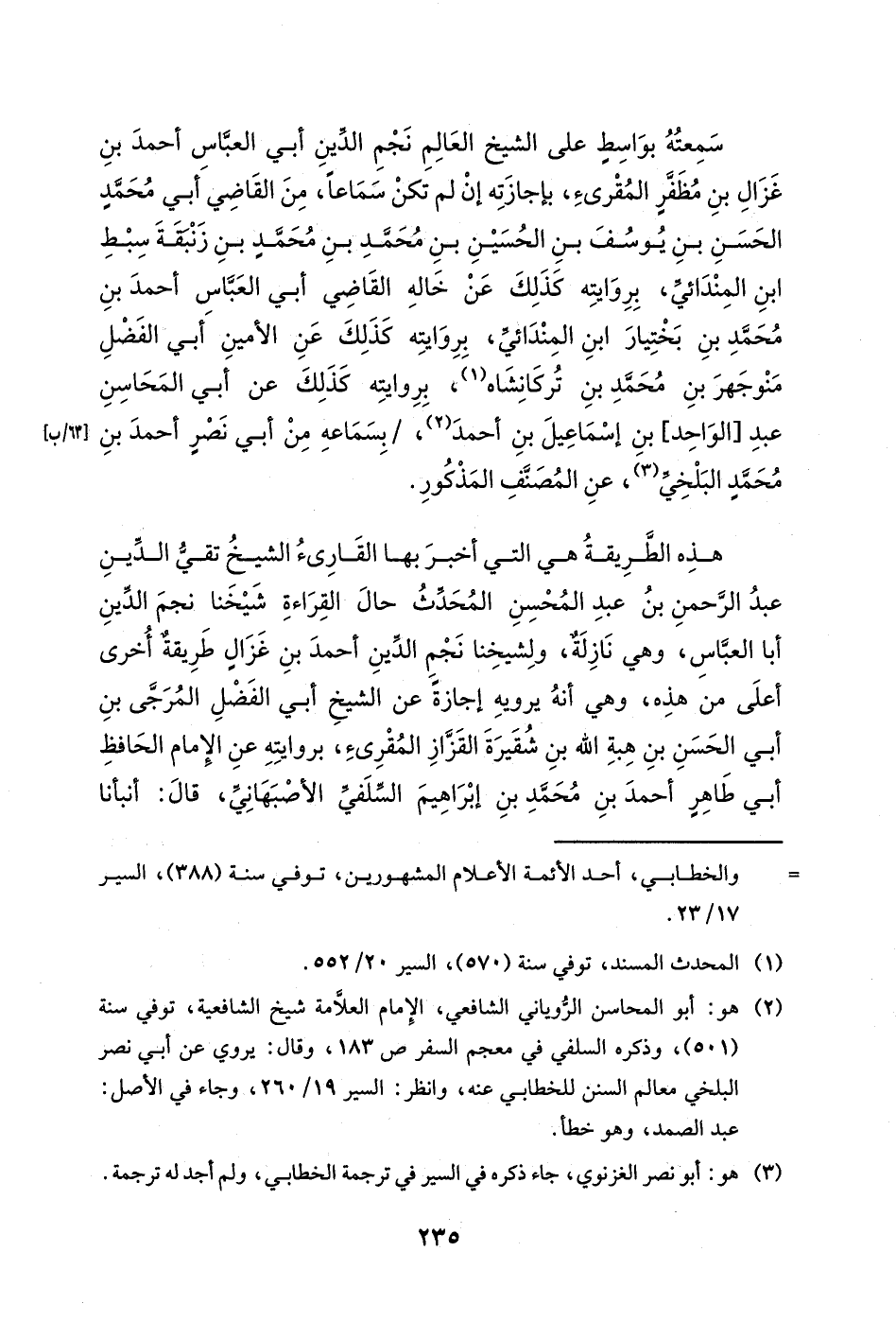 قرأته على الشيخ شهاب الدين أبي الحسن علي بن ثامر بن علي بن حصين الفخري، بسماعه على شيخه شمس الدولة أبي جعفرٍ محمد بن عبد الكريم بن محمد بن أحمد بن أبي علي بن الحسن السيدي، سنة اثنتين وأربعين وست مئةٍ، بسماعه على ذاكر بن كامل بن أبي غالبٍ الخفاف، بسماعه على الحافظ أبي محمدٍ عبد الله بن أحمد بن عمر السمرقندي، بسماعه على الشيخ أبي الحسن أحمد بن عبد الواحد بن أبي الحديد السلمي، قال: حدثنا المؤلف.