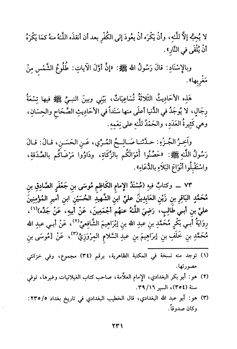 بالله، ليلة المعراج سنة تسعٍ وثلاثين وست مئةٍ، بسماعه على أبي الفتح [عبيد] الله بن عبد الله بن محمد بن نجا بن شاتيل الدباس، بسماعه على أبي غالبٍ محمد بن الحسن بن أحمد الباقلاني، بسماعه على عبد الملك بن محمد بن محمد بن عبد الله بن بشران، قال: حدثنا أبو بكرٍ أحمد بن سلمان بن الحسن النجاد الفقيه، إملاءً في شهور سنة ست، وسنة سبعٍ وأربعين وثلاث مئةٍ.