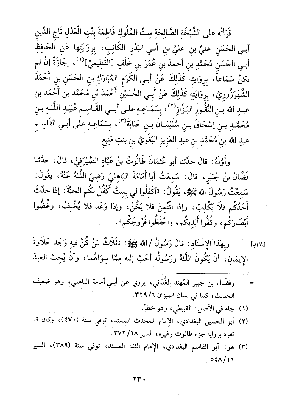 ح، وأرويه عالياً عن الشيخين أبي عبد الله محمد بن عبد الله بن عمر، وأبي البركات إسماعيل بن علي بن أحمد البغداديين، إجازةً، عن أبي منصور محمد بن عبد الملك بن خيرون كذلك، عن أبي محمد الجوهري كذلك، إن لم يكن سماعاً، عنه.