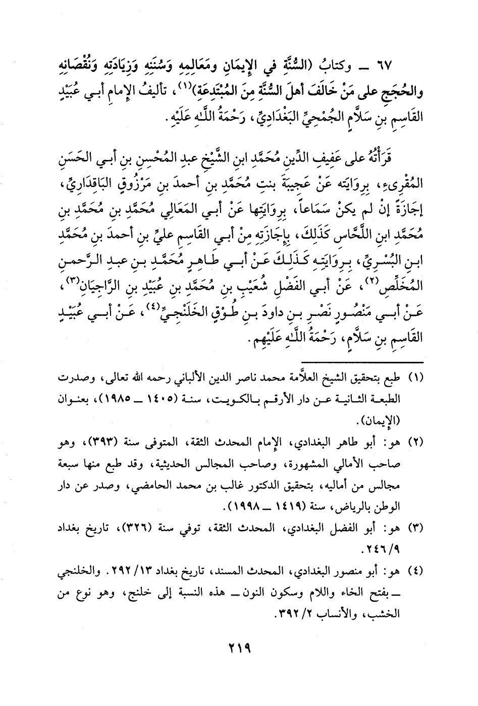 أنبأنا أبو الحسين عبد الرحمن بن عمر بن أحمد بن حمة -بالحاء المهملة وتشديد الميم- قراءةً عليه وأنا أسمع، في شعبان سنة ست وتسعين وثلاث مئةٍ، أنبأنا أبو الحسن محمد بن إبراهيم بن حبيشٍ البغوي المعدل، قراءةً عليه في عشية يوم الأربعاء، من شهر رجب سنة ست وثلاثين وثلاث مئةٍ، أنبأنا أبو عبد الله محمد بن شجاع الثلجي، وتوفي في آخر سنة خمسٍ وستين، وأول سنة ست وستين ومئتين، وولد ابن حبيش يوم الجمعة لسبع بقين من شعبان سنة اثنتين وخمسين ومئتين.