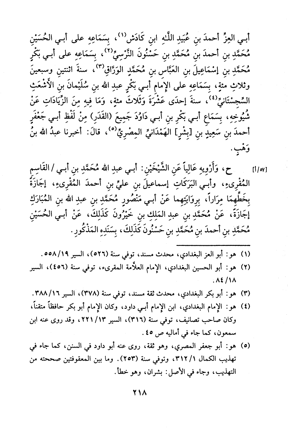 ح، وأرويه أيضاً عن جماعةٍ، منهم: أبو عبد الله محمد بن أبي القاسم، عبد الله بن عمر المقرئ، وأبو الفضل سليمان بن حمزة بن حمدٍ المقدسي، وأبو بكرٍ [عبد الله بن أبي السعادات بن منصور] الخطيب البابصري، إجازةً بخطوطهم مراراً، بروايتهم كذلك عن أبي محمدٍ الأنجب بن أبي السعادات بن عبد الرحمن الحمامي، بروايته عن الرئيس أبي الفرج مسعود بن الحسن الثقفي المذكور، بسنده.