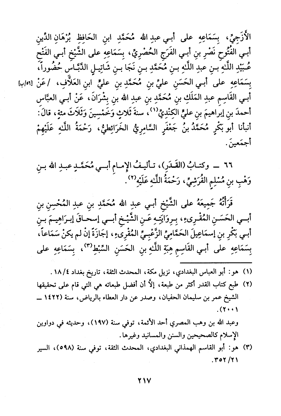 قرأته على الشيخ العالم رشيد الدين أبي عبد الله محمد بن عبد الله بن عمر بن أبي القاسم المقرئ، بسماعه على الشيخ أبي حفص عمر بن أبي المجد كرم بن أبي الحسن الدينوري الحمامي، في جمادى الآخرة من سنة سبعٍ وعشرين وست مئةٍ، بسماعه على أبي الوقت عبد الأول بن عيسى بن شعيبٍ السجزي الصوفي الهروي، في جمادى الآخرة من سنة ثلاثٍ وخمسين وخمس مئةٍ، بسماعه على الشيخ أبي العطاء عبد الأعلى بن عبد الواحد بن أحمد بن أبي القاسم بن محمد بن أحمد بن داود بن عبد الرحمن المليحي، في الجامع بهراة، سنة اثنتين وسبعين وأربع مئةٍ، بسماعه على الإمام أبي محمدٍ إسماعيل بن إبراهيم المؤلف الهروي الفقيه، من لفظه، في رجبٍ سنة عشرٍ وأربع مئةٍ.