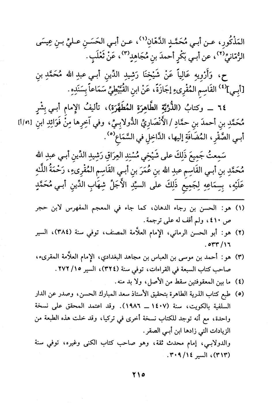 ح، وأرويه إجازةً عن جماعةٍ، منهم: عبد الأحد بن أبي القاسم بن عبد الغني بن محمد بن تيمية، وقاضي القضاة تقي الدين سليمان بن حمزة بن أحمد المقدسي، وصدر الدين إسماعيل بن يوسف بن مكتومٍ، وأبو محمد عيسى بن عبد الرحمن بن معالي بن المطعم، بسماعهم جميعاً، وحضور الأول في الخامسة على أبي المنجى عبد الله بن عمر بن علي بن زيدٍ بن اللتي الحريمي، بسماعه على أبي الوقت عبد الأول، بسنده.