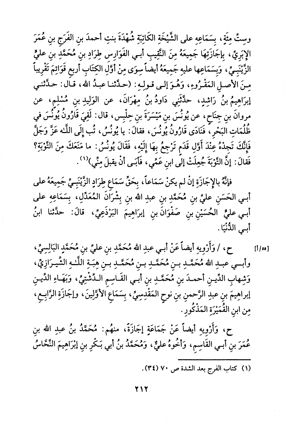 قرأته على الشيخ مسند العراق رشيد الدين أبي عبد الله محمد بن أبي القاسم المقرئ، بروايته إجازةً عن والده الشيخ الصالح نجيب الدين أبي القاسم عبد الله بن عمر، وخلقٍ كثيرٍ سواه، بروايتهم جميعاً عن الحافظ أبي محمد عبد العزيز بن محمود بن المبارك بن محمود بن الأخضر، إجازةً إن لم يكن سماعاً لأحدهم [و] برواية والده أيضاً عن الشيخ ضياء الدين أحمد بن عبد الوهاب بن علي بن علي بن سكينة.