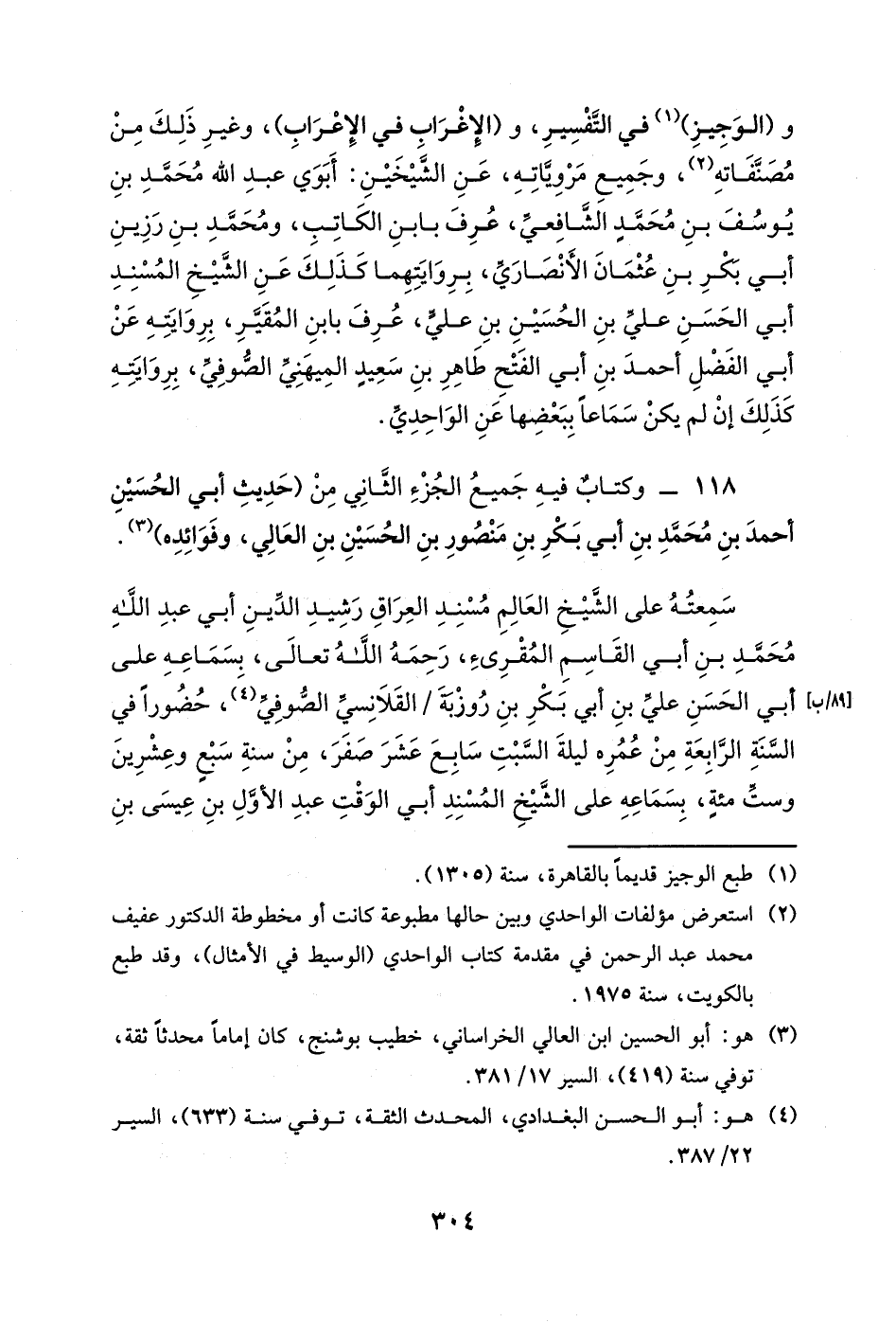 و (الوجيز) في التفسير، و (الإغراب في الإعراب) ، وغير ذلك من مصنفاته، وجميع مروياته، عن الشيخين: أبوي عبد الله محمد بن يوسف بن محمد الشافعي، عرف بابن الكاتب، ومحمد بن زرين أبي بكر بن عثمان الأنصاري، بروايتهما كذلك عن الشيخ المسند أبي الحسن علي بن الحسين بن علي، عرف بابن المقير، بروايته عن أبي الفضل أحمد بن أبي الفتح طاهر بن سعيد الميهني الصوفي، بروايته كذلك إن لم يكن سماعاً ببعضها عن الواحدي.