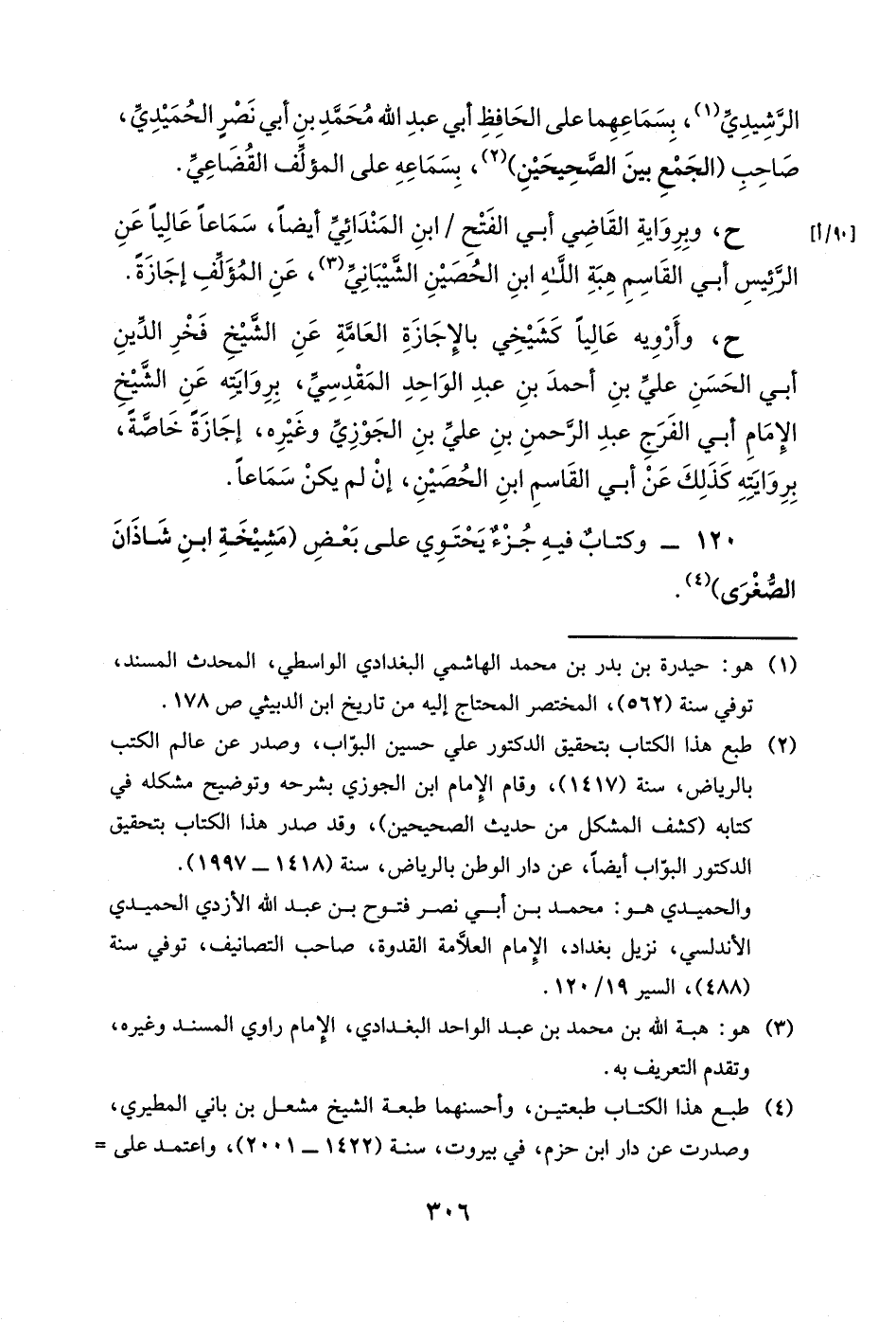 ح، وأرويه عالياً كشيخي بالإجازة العامة عن الشيخ فخر الدين أبي الحسن علي بن أحمد بن عبد الواحد المقدسي، بروايته عن الشيخ الإمام أبي الفرج عبد الرحمن بن علي بن الجوزي وغيره، إجازةً خاصةً، بروايته كذلك عن أبي القاسم ابن الحصين، إن لم يكن سماعاً.