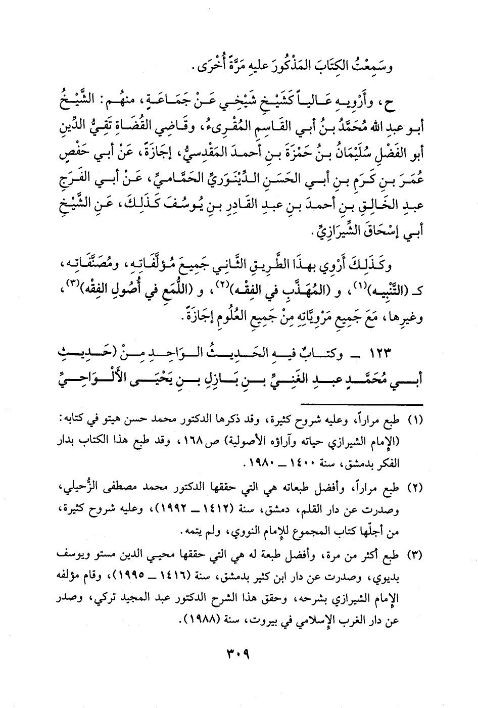 وكذلك أروي بهذا الطريق الثاني جميع مؤلفاته، ومصنفاته، كـ (التنبيه) ، و (المهذب في الفقه) ، و (اللمع في أصول الفقه) ، وغيرها، مع جميع مروياته من جميع العلوم إجازةً.
