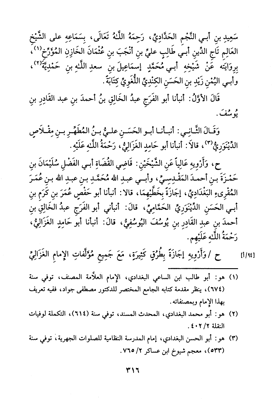 ح، وأرويه عالياً عن الشيخين: قاضي القضاة أبي الفضل سليمان بن حمزة بن أحمد المقدسي وأبي عبد الله بن عمر المقرئ البغدادي، إجازةً بخطيهما، قالا: أنبأنا أبو حفص عمر بن كرم بن أبي الحسن الدينوري الحمامي، قال: أنبأني أبو الفرج عبد الخالق بن أحمد بن عبد القادر بن يوسف اليوسفي، قال: أنبأنا أبو حامدٍ الغزالي، رحمة الله عليهم.