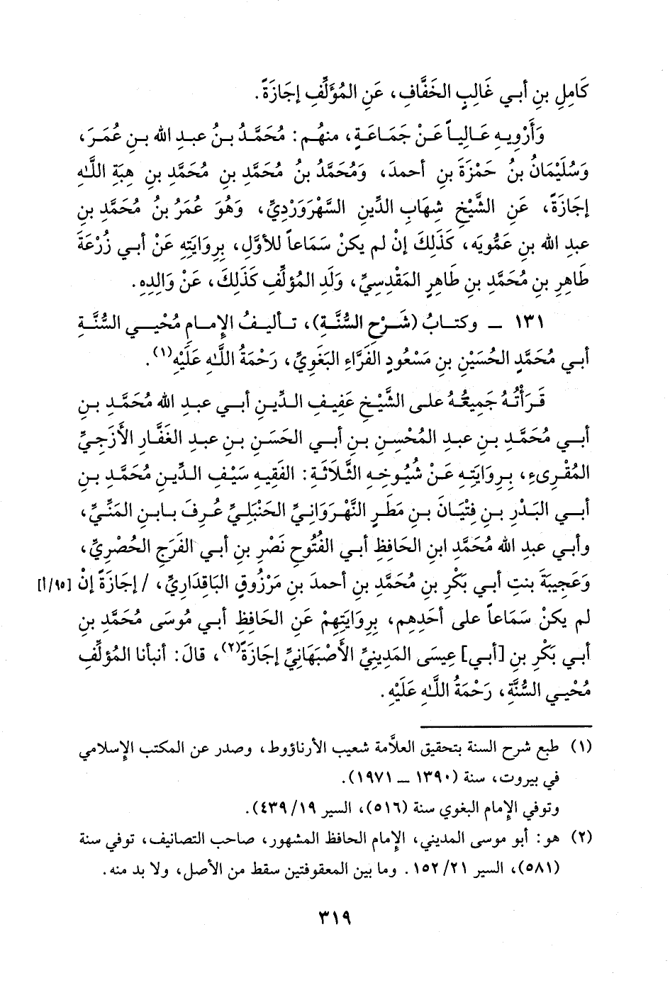 قرأته جميعه على الشيخ عفيف الدين أبي عبد الله محمد بن أبي محمد بن عبد المحسن بن أبي الحسن بن عبد الغفار الأزجي المقرئ، بروايته عن شيوخه الثلاثة: الفقيه سيف الدين محمد بن أبي البدر بن فتيان بن مطر النهرواني الحنبلي عرف بابن المني، وأبي عبد الله محمد ابن الحافظ أبي الفتوح نصر بن أبي الفرج الحصري، وعجيبة بنت أبي بكر بن محمد بن أحمد بن مرزوق الباقداري، إجازةً إن لم يكن سماعاً على أحدهم، بروايتهم عن الحافظ أبي موسى محمد بن أبي بكر بن [أبي] عيسى المديني الأصبهاني إجازةً، قال: أنبأنا المؤلف محيي السنة، رحمة الله عليه.