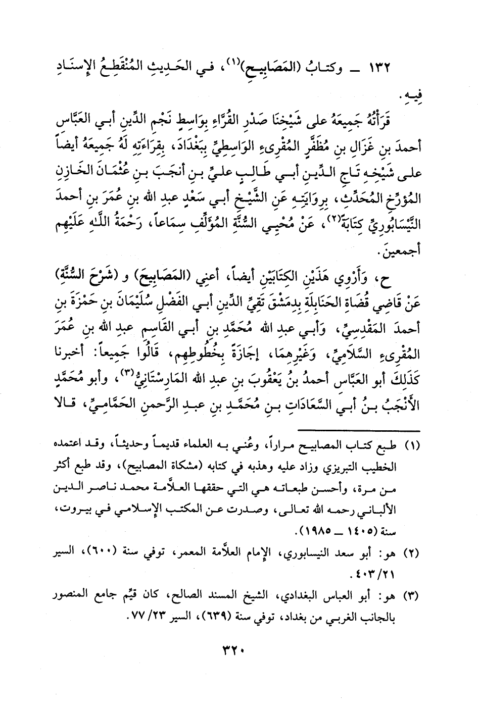 ح، وأروي هذين الكتابين أيضاً، أعني (المصابيح) و (شرح السنة) عن قاضي قضاة الحنابلة بدمشق تقي الدين أبي الفضل سليمان بن حمزة بن أحمد المقدسي، وأبي عبد الله محمد بن أبي القاسم عبد الله بن عمر المقرئ السلامي، وغيرهما، إجازةً بخطوطهم، قالوا جميعاً: أخبرنا كذلك أبو العباس أحمد بن يعقوب بن عبد الله المارستاني، وأبو محمدٍ الأنجب بن أبي السعادات بن محمد بن عبد الرحمن الحمامي، قالا