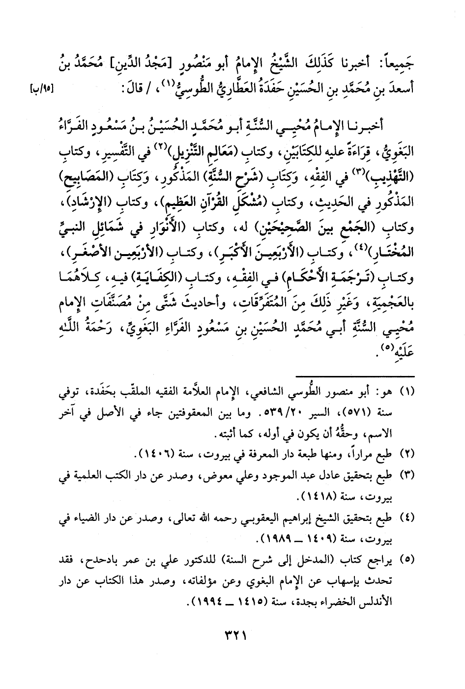 أخبرنا الإمام محيي السنة أبو محمد الحسين بن مسعود الفراء البغوي قراءةً عليه للكتابين، وكتاب (معالم التنزيل) في التفسير، وكتاب (التهذيب) في الفقه، وكتاب (شرح السنة) المذكور، وكتاب (المصابيح) المذكور في الحديث، وكتاب (مشكل القرآن العظيم) ، وكتاب (الإرشاد) ، وكتاب (الجمع بين الصحيحين) له، وكتاب (الأنوار في شمائل النبي المختار) ، وكتاب (الأربعين الأكبر) ، وكتاب (الأربعين الأصغر) ، وكتاب (ترجمة الأحكام) في الفقه، وكتاب (الكفاية) فيه، كلاهما بالعجمية، وغير ذلك من المتفرقات، وأحاديث شتى من مصنفات الإمام محيي السنة أبي محمد الحسين بن مسعودٍ الفراء البغوي، رحمة الله عليه.