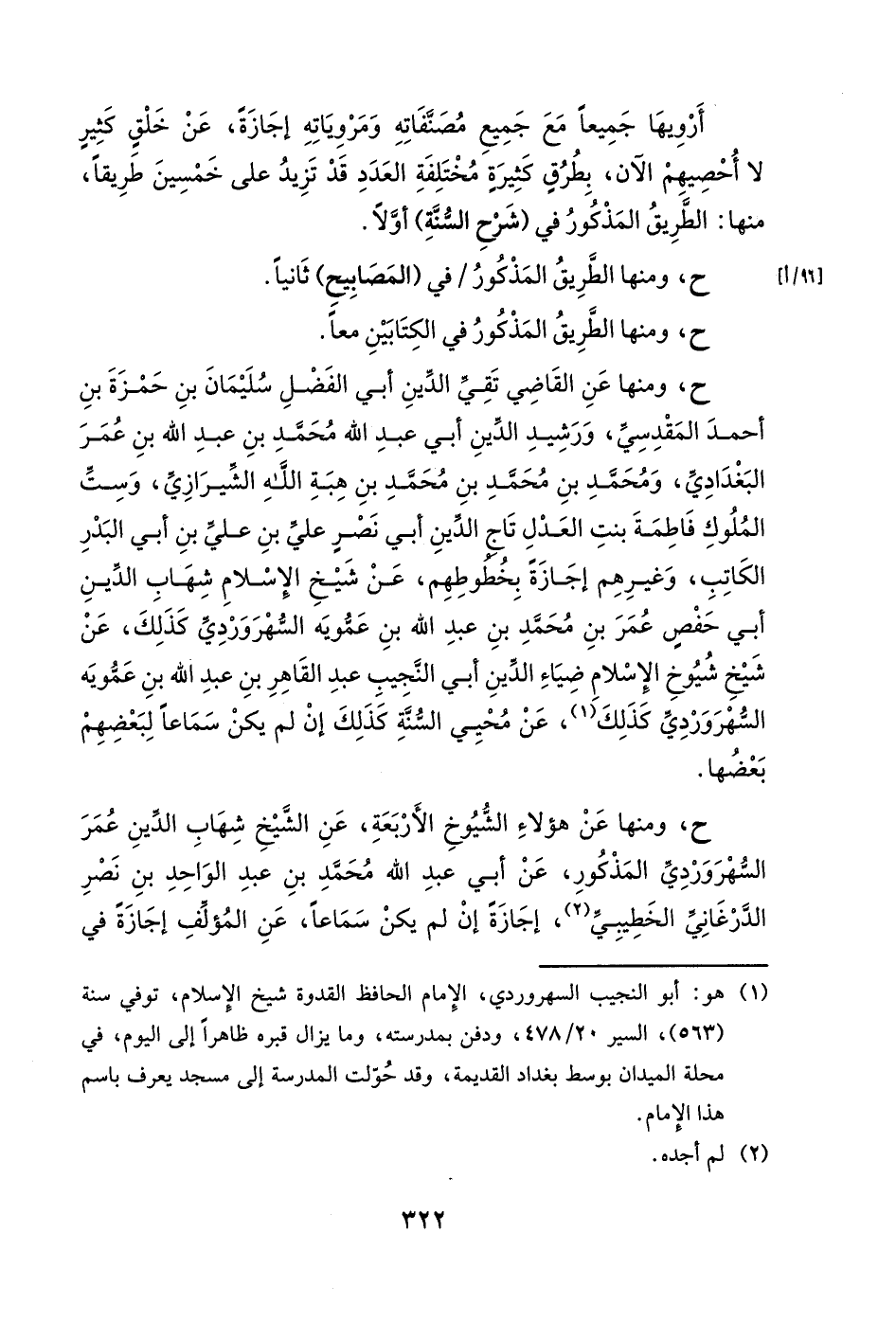 ح، ومنها عن القاضي تقي الدين أبي الفضل سليمان بن حمزة بن أحمد المقدسي، ورشيد الدين أبي عبد الله محمد بن عبد الله بن عمر البغدادي، ومحمد بن محمد بن محمد بن هبة الله الشيرازي، وست الملوك فاطمة بنت العدل تاج الدين أبي نصرٍ علي بن علي بن أبي البدر الكاتب، وغيرهم إجازةً بخطوطهم، عن شيخ الإسلام شهاب الدين أبي حفصٍ عمر بن محمد بن عبد الله بن عمويه السهروردي كذلك، عن شيخ شيوخ الإسلام ضياء الدين أبي النجيب عبد القاهر بن عبد الله بن عمويه السهروردي كذلك، عن محيي السنة كذلك إن لم يكن سماعاً لبعضهم بعضها.