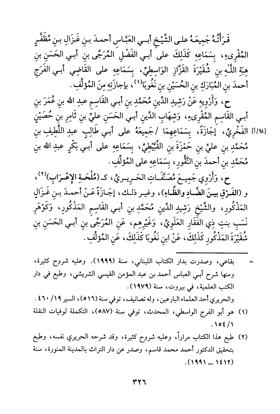 ح، وأروي جميع مصنفات الحريري، كـ (ملحة الإعراب) ، و (الفرق بين الضاد والظاء) ، وغير ذلك، إجازةً عن أحمد بن غزال المذكور، والشيخ رشيد الدين محمد بن أبي القاسم المذكور، وكوهر نسب بنت ذي الفقار العلوي، وغيرهم، عن المرجى بن أبي الحسن بن شقيرة المذكور كذلك، عن أبي نغوبا كذلك، عن المؤلف.
