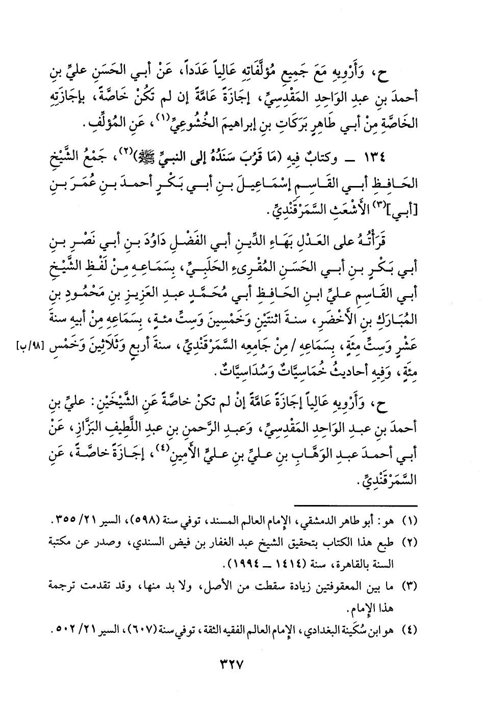 ح، وأرويه مع جميع مؤلفاته عالياً عدداً، عن أبي الحسن علي بن أحمد بن عبد الواحد المقدسي، إجازةً عامةً إن لم تكن خاصةً، بإجازته الخاصة من أبي طاهرٍ بركات بن إبراهيم الخشوعي، عن المؤلف.