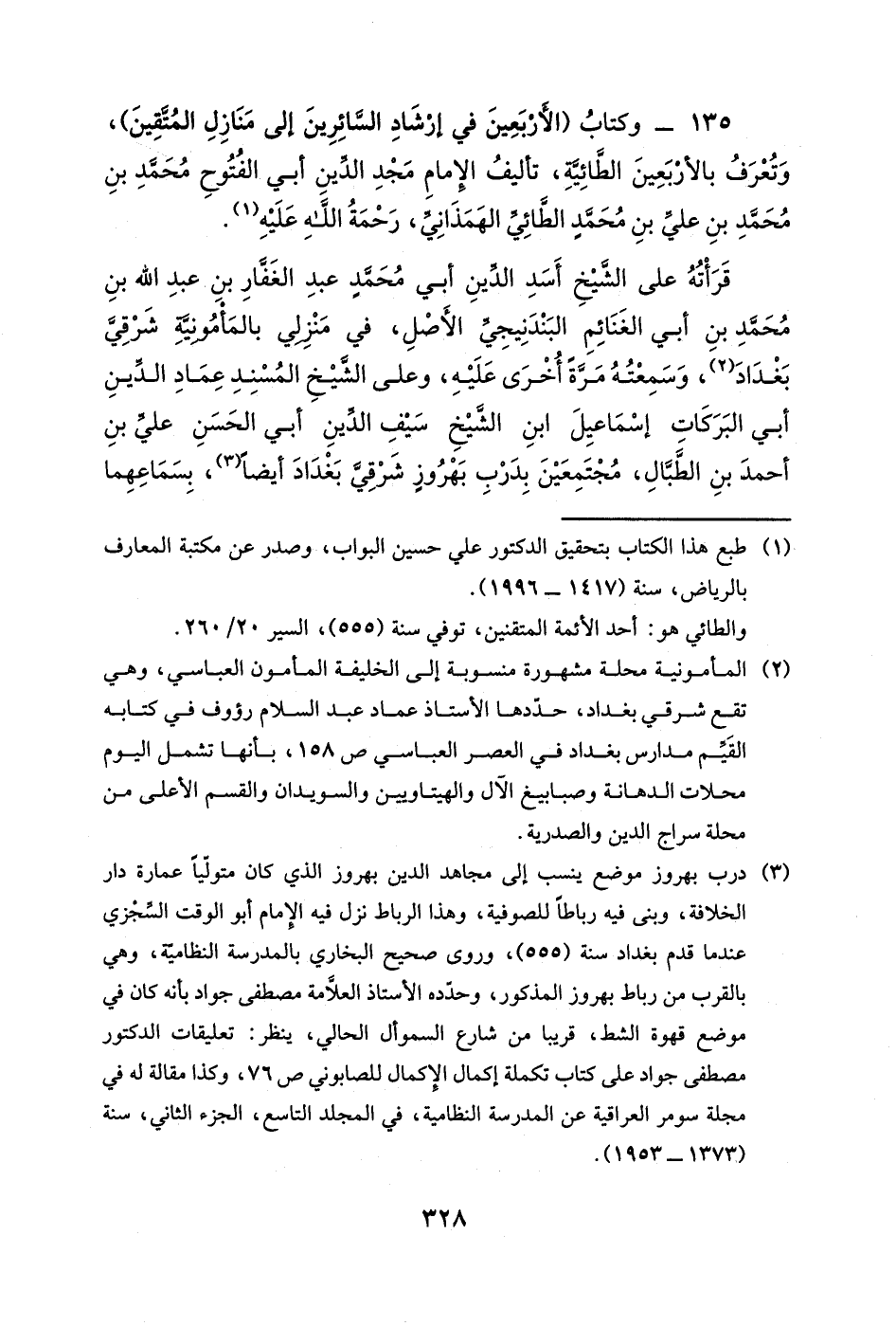 135- وكتاب (الأربعين في إرشاد السائرين إلى منازل المتقين) ، وتعرف بالأربعين الطائية، تأليف الإمام مجد الدين أبي الفتوح محمد بن محمد بن علي بن محمد الطائي الهمذاني، رحمة الله عليه.