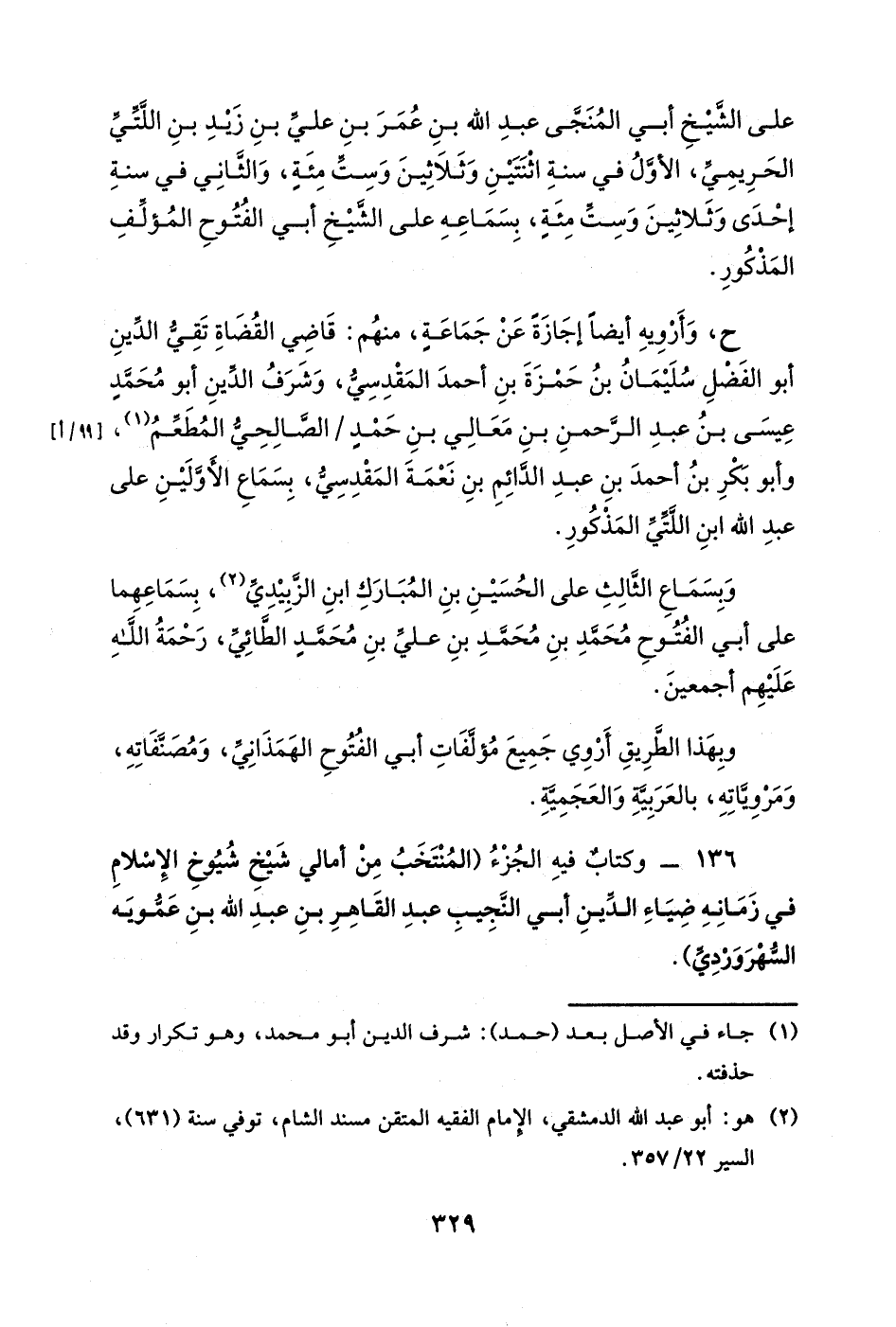ح، وأرويه أيضاً إجازةً عن جماعةٍ، منهم: قاضي القضاة تقي الدين أبو الفضل سليمان بن حمزة بن أحمد المقدسي، وشرف الدين أبو محمد عيسى بن عبد الرحمن بن معالي بن حمد الصالحي المطعم، وأبو بكر بن أحمد بن عبد الدائم بن نعمة المقدسي، بسماع الأولين على عبد الله ابن اللتي المذكور.