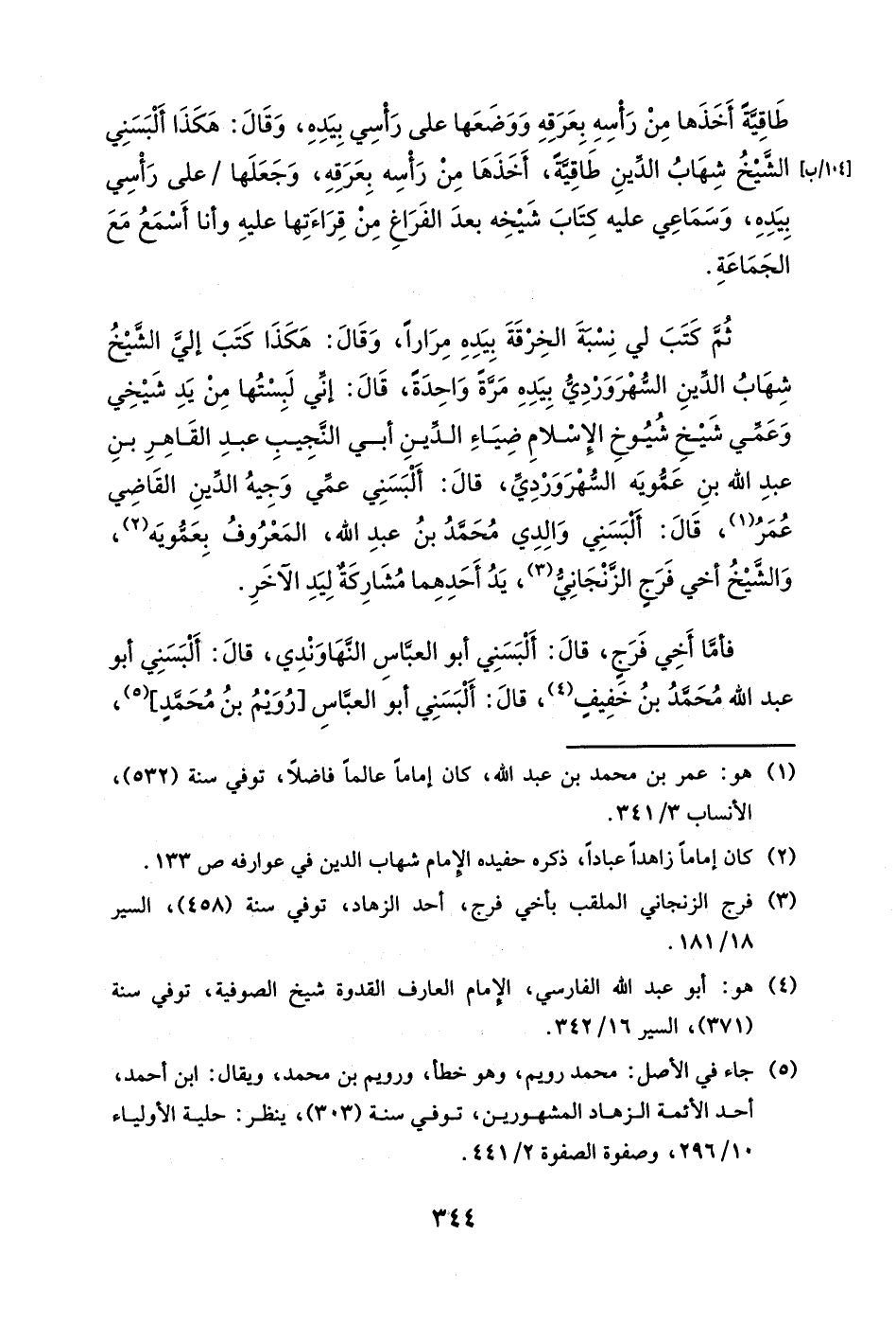 ثم كتب لي نسبة الخرقة بيده مراراً، وقال: هكذا كتب إلي الشيخ شهاب الدين السهروردي بيده مرةً واحدةً، قال: إني لبستها من يد شيخي وعمي شيخ شيوخ الإسلام ضياء الدين أبي النجيب عبد القاهر بن عبد الله بن عمويه السهروردي، قال: ألبسني عمي وجيه الدين القاضي عمر، قال: ألبسني والدي محمد بن عبد الله، المعروف بعمويه، والشيخ أخي فرجٍ الزنجاني، يد أحدهما مشاركةٌ ليد الآخر.