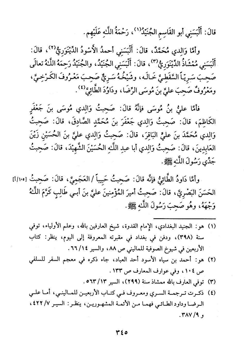 وأما والدي محمدٌ، قال: ألبسني أحمد الأسود الدينوري، قال: ألبسني ممشاذ الدينوري، قال: ألبسني الجنيد، والجنيد رحمه الله تعالى صحب سرياً السقطي خاله، وشيخه سري صحب معروف الكرخي، ومعروفٌ صحب علي بن موسى الرضا، وداود الطائي.