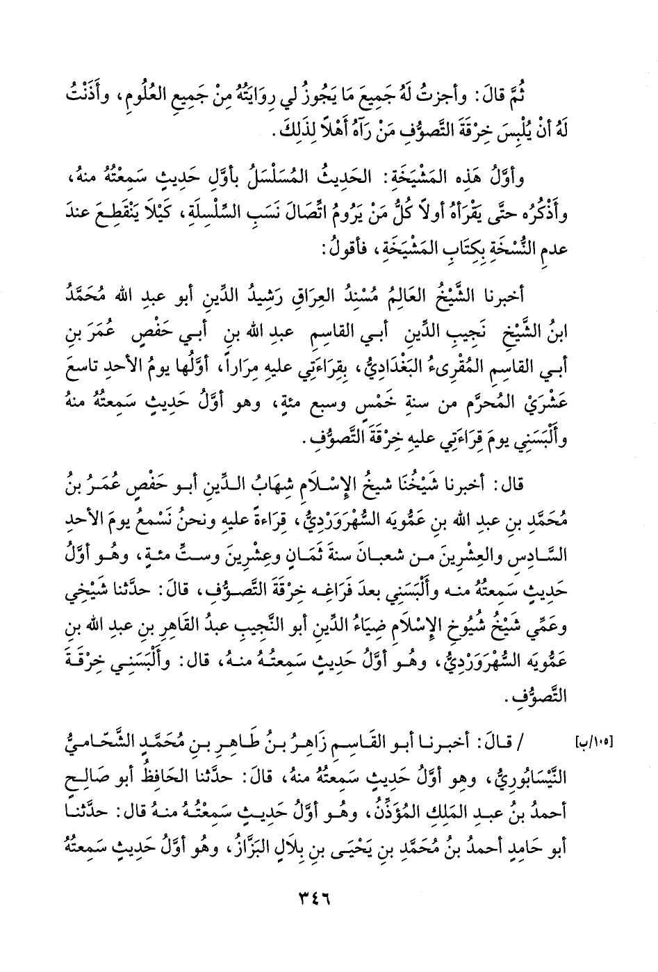 قال: أخبرنا شيخنا شيخ الإسلام شهاب الدين أبو حفص ٍ عمر بن محمد بن عبد الله بن عمويه السهروردي، قراءةً عليه ونحن نسمع يوم الأحد السادس والعشرين من شعبان سنة ثمانٍ وعشرين وست مئةٍ، وهو أول حديثٍ سمعته منه وألبسني بعد فراغه خرقة التصوف، قال: حدثنا شيخي وعمي شيخ شيوخ الإسلام ضياء الدين أبو النجيب عبد القاهر بن عبد الله بن عمويه السهروردي، وهو أول حديثٍ سمعته منه، قال: وألبسني خرقة التصوف.