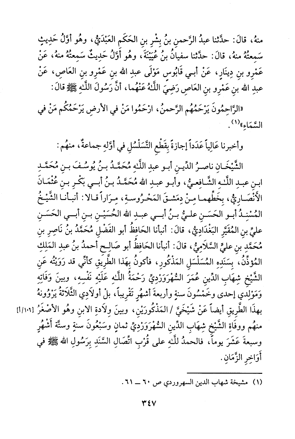 الشيخان ناصر الدين أبو عبد الله محمد بن يوسف بن محمد ابن عبد الله الشافعي، وأبو عبد الله محمد بن أبي بكر بن عثمان الأنصاري بخطهما من دمشق المحروسة، مراراً قالا: أنبأنا الشيخ المسند أبو الحسن علي بن أبي عبد الله الحسين بن أبي الحسن علي بن المقير البغدادي، قال: أنبأنا الحافظ أبو الفضل محمد بن ناصر بن محمد بن علي السلامي، قال: أنبأنا الحافظ أبو صالح أحمد بن عبد الملك المؤذن، بسنده المسلسل المذكور، فأكون بهذا الطريق كأني قد رويته عن الشيخ شهاب الدين عمر السهروردي رحمة الله عليه نفسه، وبين وفاته ومولدي إحدى وخمسون سنةٍ وأربعة أشهرٍ تقريباً، بل أولادي الثلاثة يروونه بهذا الطريق أيضاً عن شيخي المذكورين، وبين ولادة الابن وهو الأصغر منهم ووفاة الشيخ شهاب الدين السهروردي ثمانٍ وسبعون سنةٍ وستة أشهرٍ وسبعة عشر يوماً، فالحمد لله على قرب اتصال السند برسول الله صلى الله عليه وسلم في أواخر الزمان.