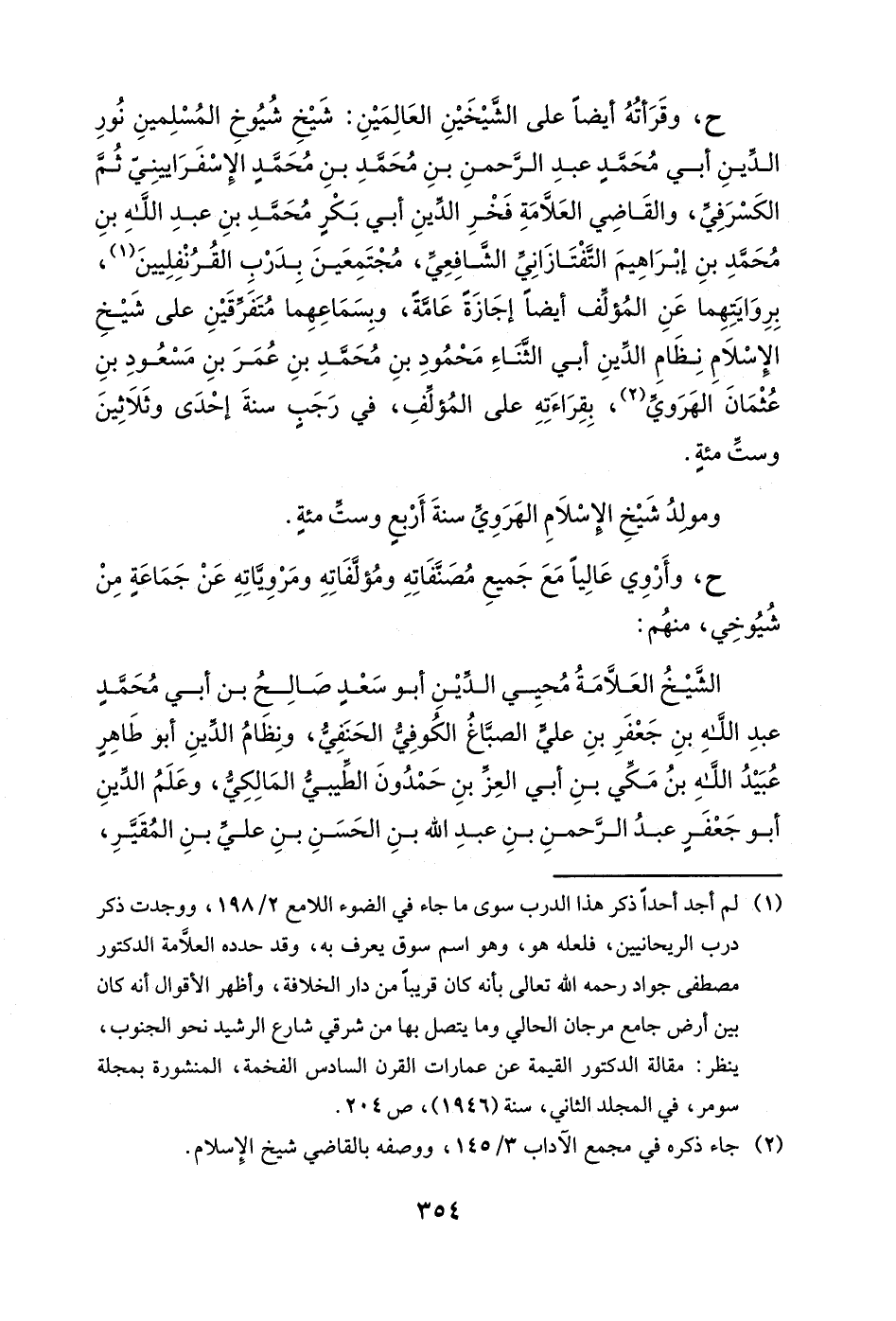 ح، وقرأته أيضاً على الشيخين العالمين: شيخ شيوخ المسلمين نور الدين أبي محمدٍ عبد الرحمن بن محمد بن محمد الإسفراييني ثم الكسرفي، والقاضي العلامة فخر الدين أبي بكرٍ محمد بن عبد الله بن محمد بن إبراهيم التفتازاني الشافعي، مجتمعين بدرب القرنفليين، بروايتهما عن المؤلف أيضاً إجازةً عامةً، وبسماعهما متفرقين على شيخ الإسلام نظام الدين أبي الثناء محمود بن محمد بن عمر بن مسعود بن عثمان الهروي، بقراءته على المؤلف، في رجبٍ سنة إحدى وثلاثين وست مئةٍ.