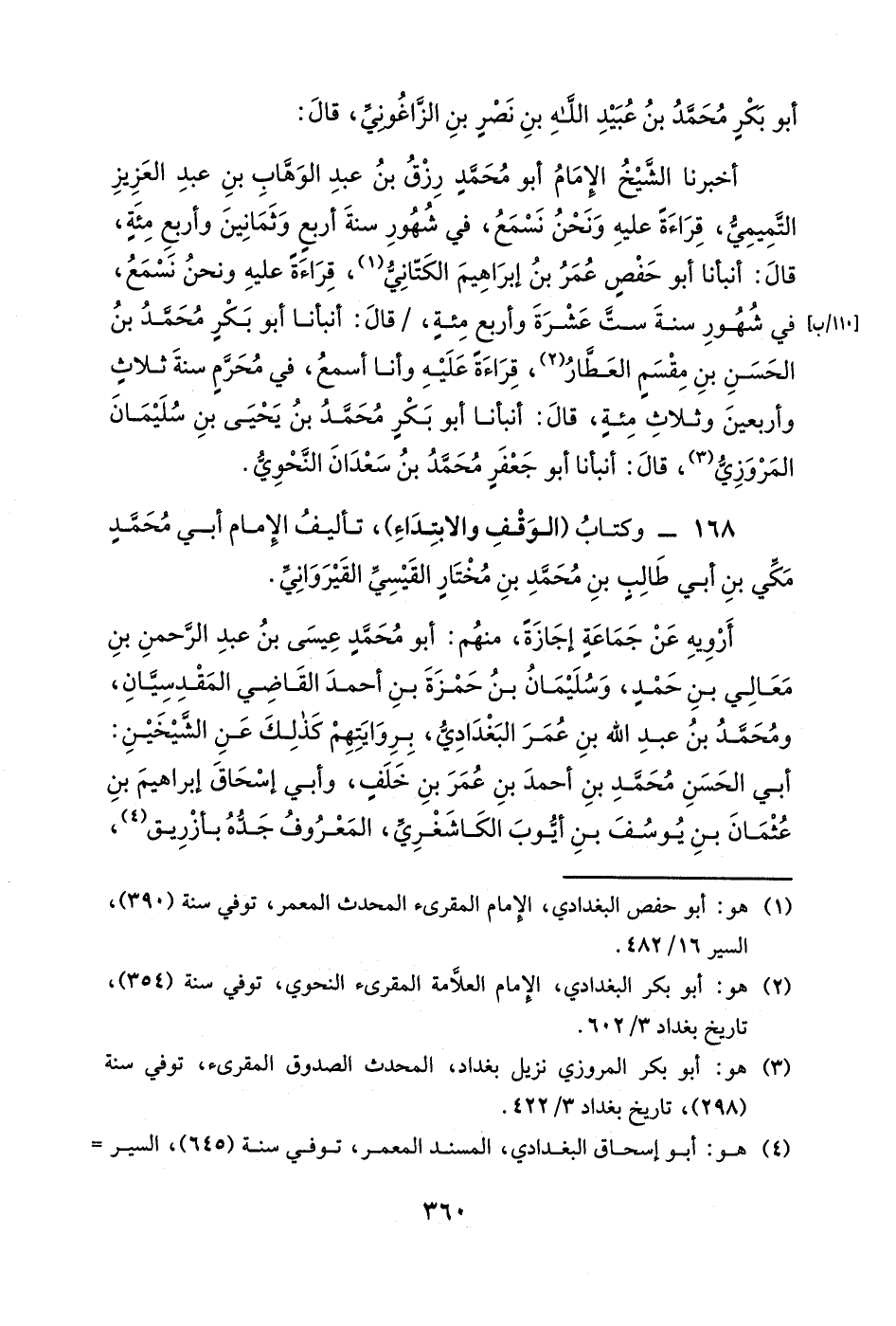 أخبرنا الشيخ الإمام أبو محمد رزق بن عبد الوهاب بن عبد العزيز التميمي، قراءةً عليه ونحن نسمع، في شهور سنة أربعٍ وثمانين وأربع مئةٍ، قال: أنبأنا أبو حفص عمر بن إبراهيم الكتاني، قراءةً عليه ونحن نسمع، في شهور سنة ست عشرة وأربع مئةٍ، قال: أنبأنا أبو بكر محمد بن الحسن بن مقسم العطار، قراءةً عليه وأنا أسمع، في محرمٍ سنة ثلاث وأربعين وثلاث مئةٍ، قال: أنبأنا أبو بكر محمد بن يحيى بن سليمان المروزي، قال: أنبأنا أبو جعفرٍ محمد بن سعدان النحوي.