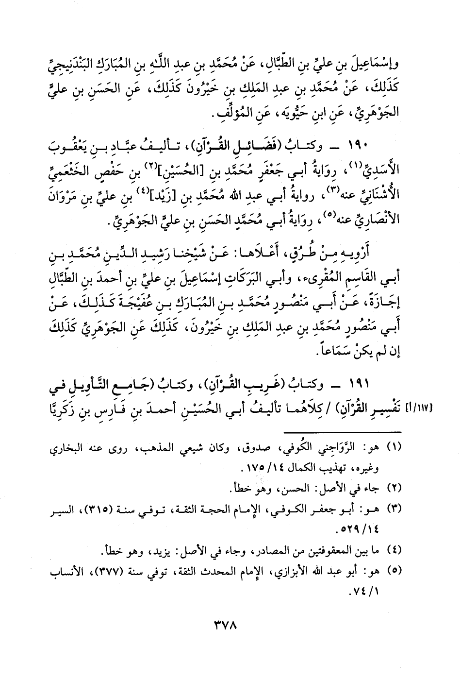 190- وكتاب (فضائل القرآن) ، تأليف عباد بن يعقوب الأسدي، رواية أبي جعفر محمد بن [الحسين] بن حفصٍ الخثعمي الأشناني عنه، رواية أبي عبد الله محمد بن [زيد] بن علي بن مروان الأنصاري عنه، رواية أبي محمدٍ الحسن بن علي الجوهري.