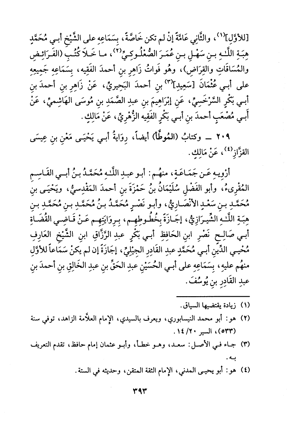[للأول] ، والثاني عامةً إن لم تكن خاصةً، بسماعه على الشيخ أبي محمد هبة الله بن سهل بن عمر الصعلوكي، ما خلا كتب (الفرائض والمساقات والقراض) ، وهو فوات زاهر بن أحمد الفقيه، بسماعه جميعه على أبي عثمان [سعيدٍ] بن أحمد البحيري، عن زاهر بن أحمد بن أبي بكر السرخسي، عن إبراهيم بن عبد الصمد بن موسى الهاشمي، عن أبي مصعب أحمد بن أبي بكر الفقيه الزهري، عن مالك.