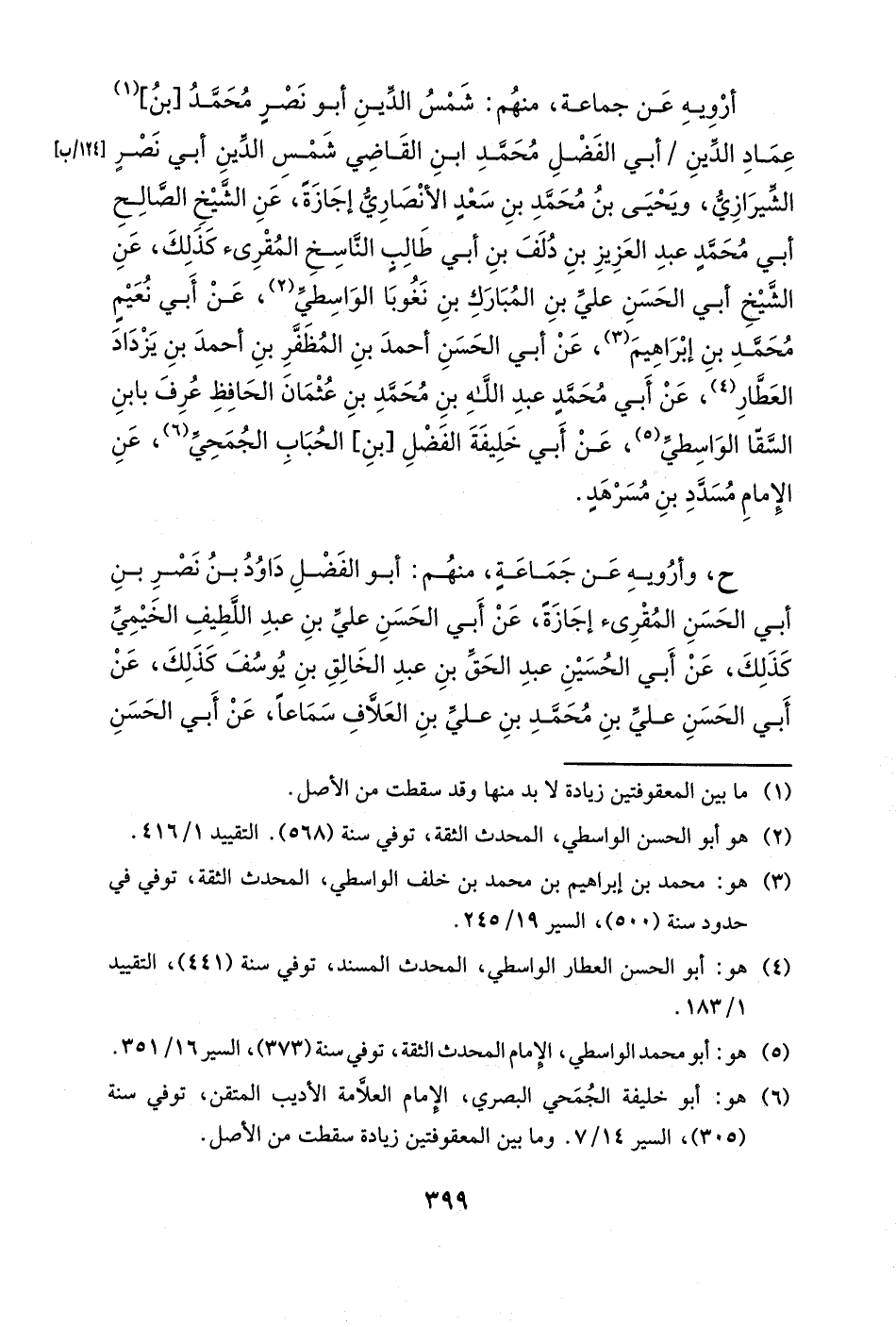 أرويه عن جماعة، منهم: شمس الدين أبو نصرٍ محمد [بن] عماد الدين أبي الفضل محمد ابن القاضي شمس الدين أبي نصرٍ الشيرازي، ويحيى بن محمد بن سعدٍ الأنصاري إجازةً، عن الشيخ الصالح أبي محمدٍ عبد العزيز بن دلف بن أبي طالب الناسخ المقرئ كذلك، عن الشيخ أبي الحسن علي بن المبارك بن نغوبا الواسطي، عن أبي نعيم محمد بن إبراهيم، عن أبي الحسن أحمد بن المظفر بن أحمد بن يزداد العطار، عن أبي محمد عبد الله بن محمد بن عثمان الحافظ عرف بابن السقا الواسطي، عن أبي خليفة الفضل [بن] الحباب الجمحي، عن الإمام مسدد بن مسرهد.