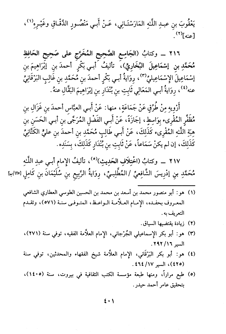 216- وكتاب (الجامع الصحيح المخرج على صحيح الحافظ محمد بن إسماعيل البخاري) ، تأليف أبي بكرٍ أحمد بن إبراهيم بن إسماعيل الإسماعيلي، رواية أبي بكرٍ أحمد بن محمد بن غالبٍ البرقاني عنه، رواية أبي المعالي ثابت بن بندار بن إبراهيم البقال عنه.