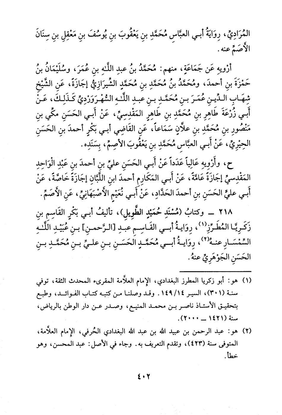 218- وكتاب (مسند حميدٍ الطويل) ، تأليف أبي بكر القاسم بن زكريا المطرز، رواية أبي القاسم عبد [الرحمن] بن عبيد الله السمسار عنه، رواية أبي محمدٍ الحسن بن علي بن محمد بن الحسن الجوهري عنه.