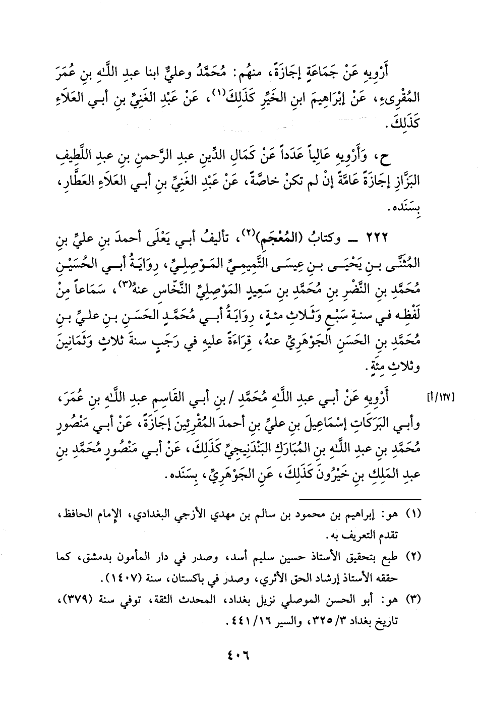 222- وكتاب (المعجم) ، تأليف أبي يعلى أحمد بن علي بن المثنى بن يحيى بن عيسى التميمي الموصلي، رواية أبي الحسين محمد بن النضر بن محمد بن سعيد الموصلي النخاس عنه، سماعاً من لفظه في سنة سبعٍ وثلاث مئةٍ، رواية أبي محمدٍ الحسن بن علي بن محمد بن الحسن الجوهري عنه، قراءةً عليه في رجبٍ سنة ثلاثٍ وثمانين وثلاث مئةٍ.