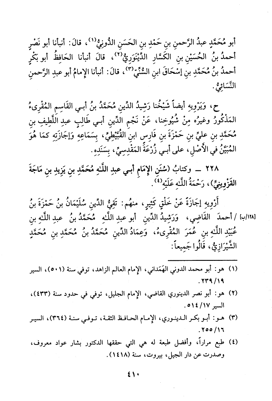 أبو محمد عبد الرحمن بن حمد بن الحسن الدوني، قال: أنبأنا أبو نصرٍ أحمد بن الحسين بن الكسار الدينوري، قال أنبأنا الحافظ أبو بكر أحمد بن محمد بن إسحاق بن السني، قالا: أنبأنا الإمام أبو عبد الرحمن النسائي.