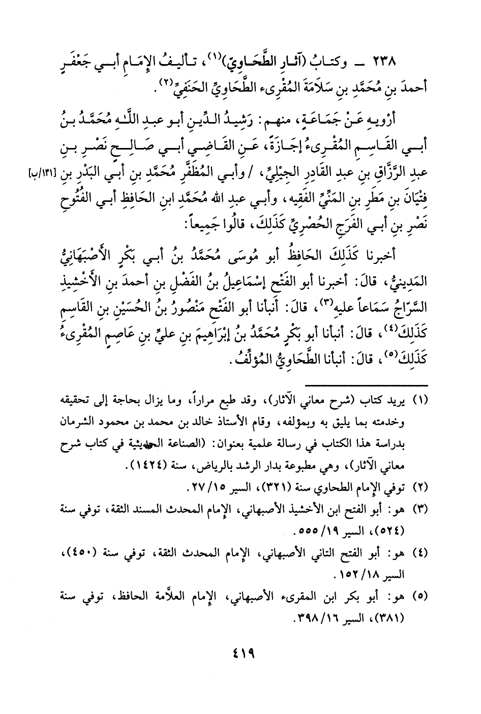 أخبرنا كذلك الحافظ أبو موسى بن أبي بكرٍ الأصبهاني المديني، قال: أخبرنا أبو الفتح إسماعيل بن الفضل بن أحمد بن الأخشيذ السراج سماعاً عليه، قال: أنبأنا أبو الفتح منصور بن الحسين بن القاسم كذلك، قال: أنبأنا أبو بكر محمد بن إبراهيم بن علي بن عاصمٍ المقرئ كذلك، قال: أنبأنا الطحاوي المؤلف.
